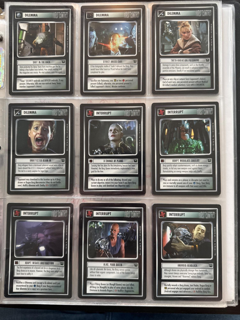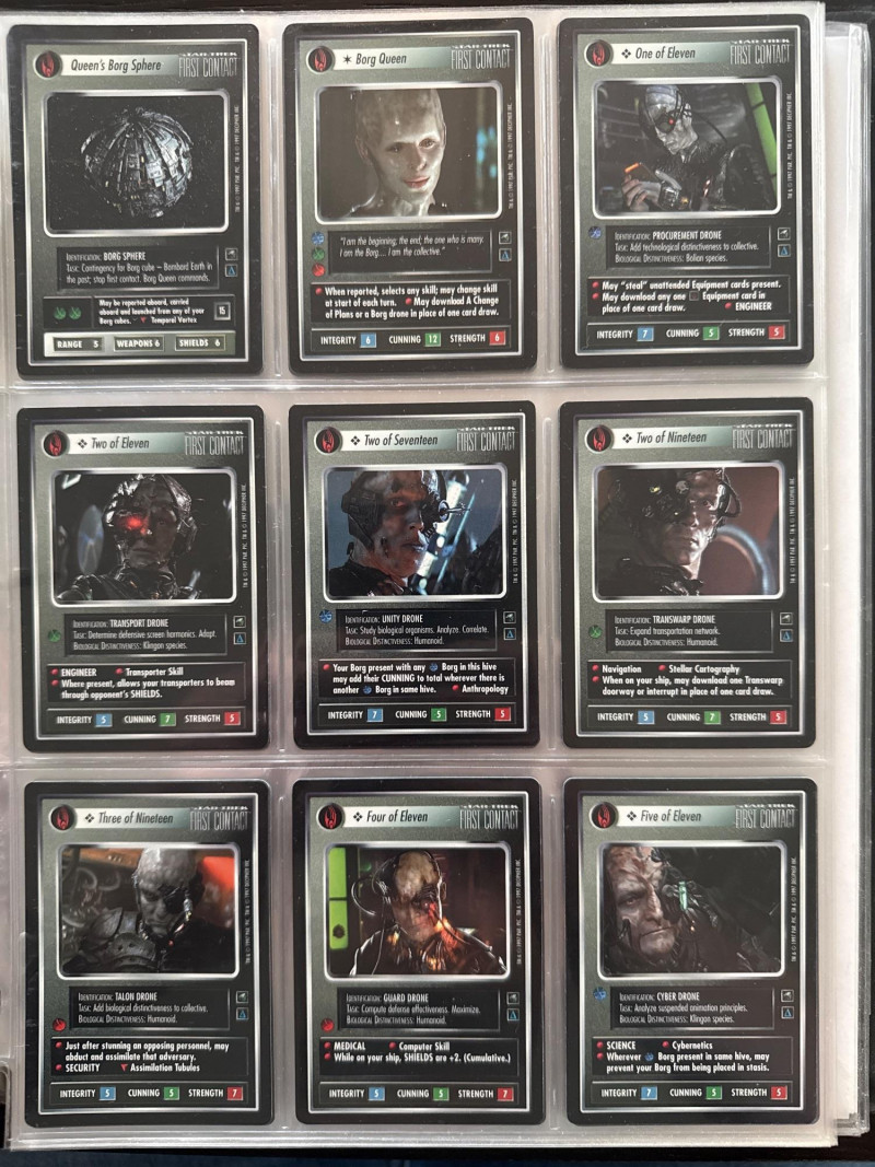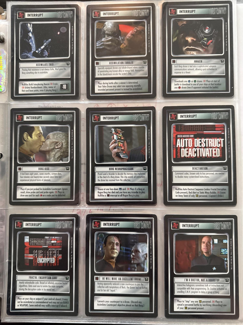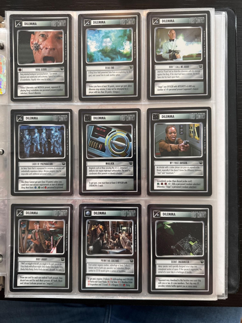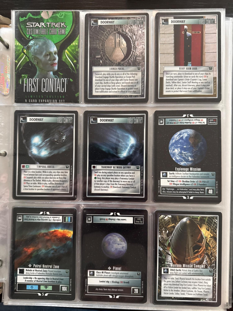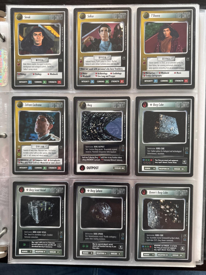 Star Trek customizable card game (CCG) in a collectors album. This album includes the following collections: Q-Continuum Black Boarder 1996 complete, Introductory Two-Player Game Black and White Boarder 1996 Complete Set, Fajo Collection Black Boarder 1997 complete, First Contact 1997 Black Boarder Complete.These collections include some rare and ultra rare cards. The cards are in near Mint condition. It does not look like they were ever used