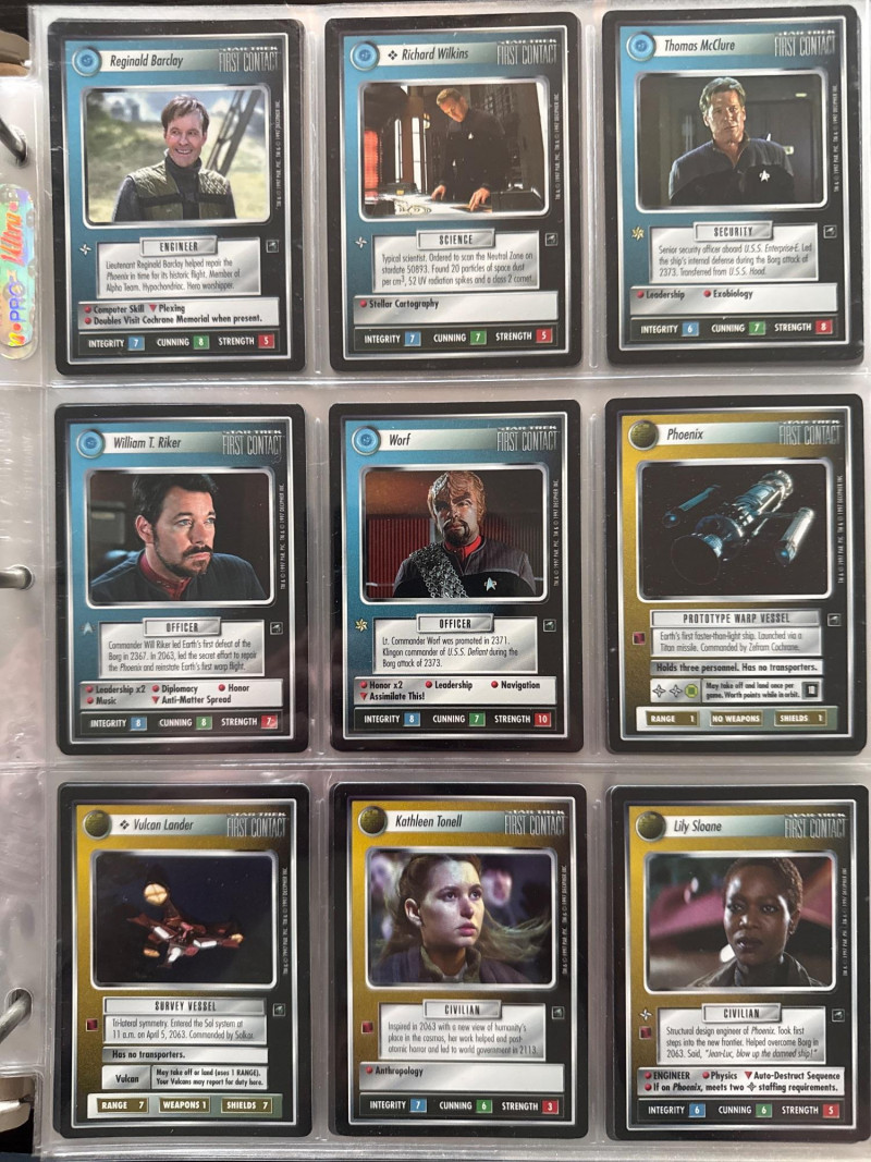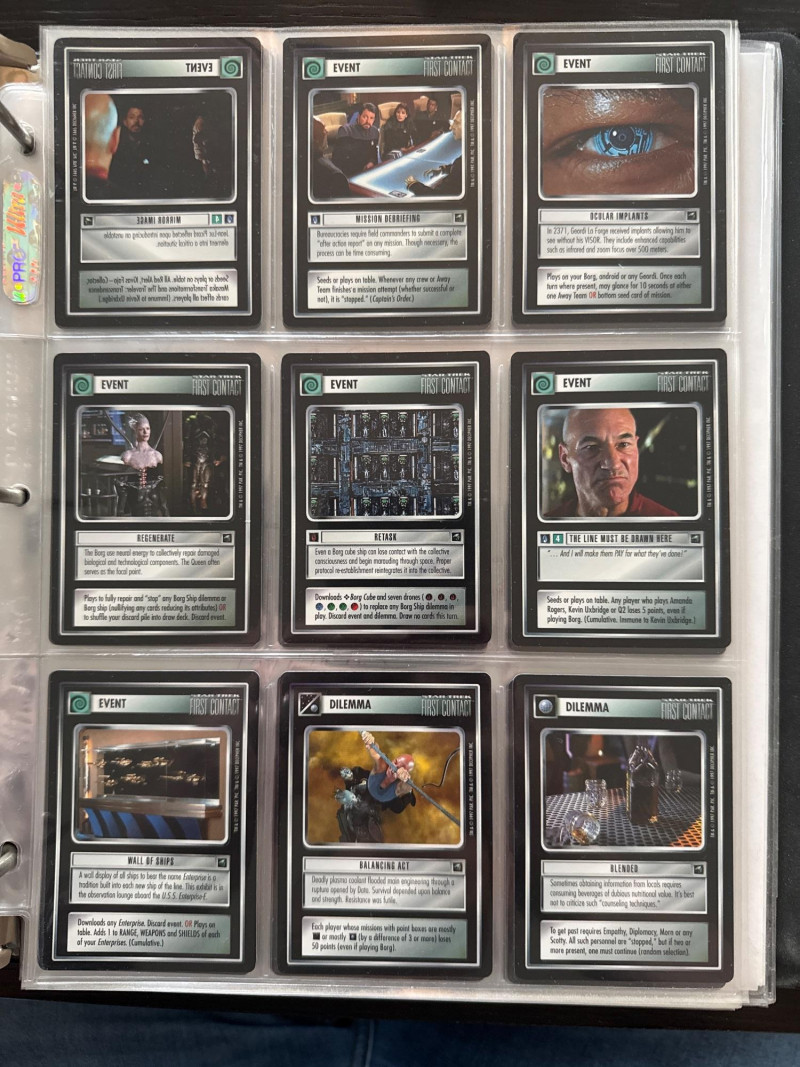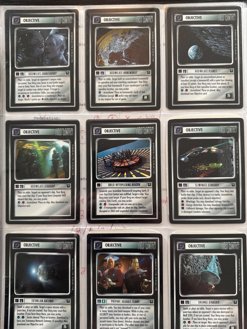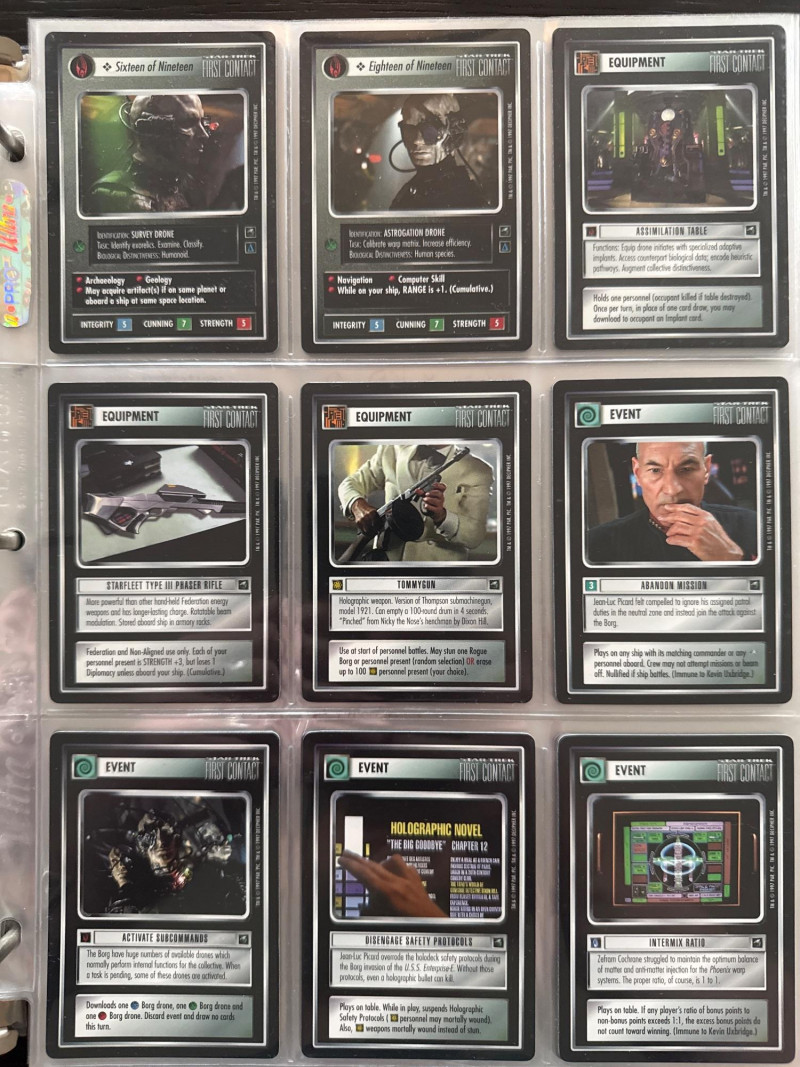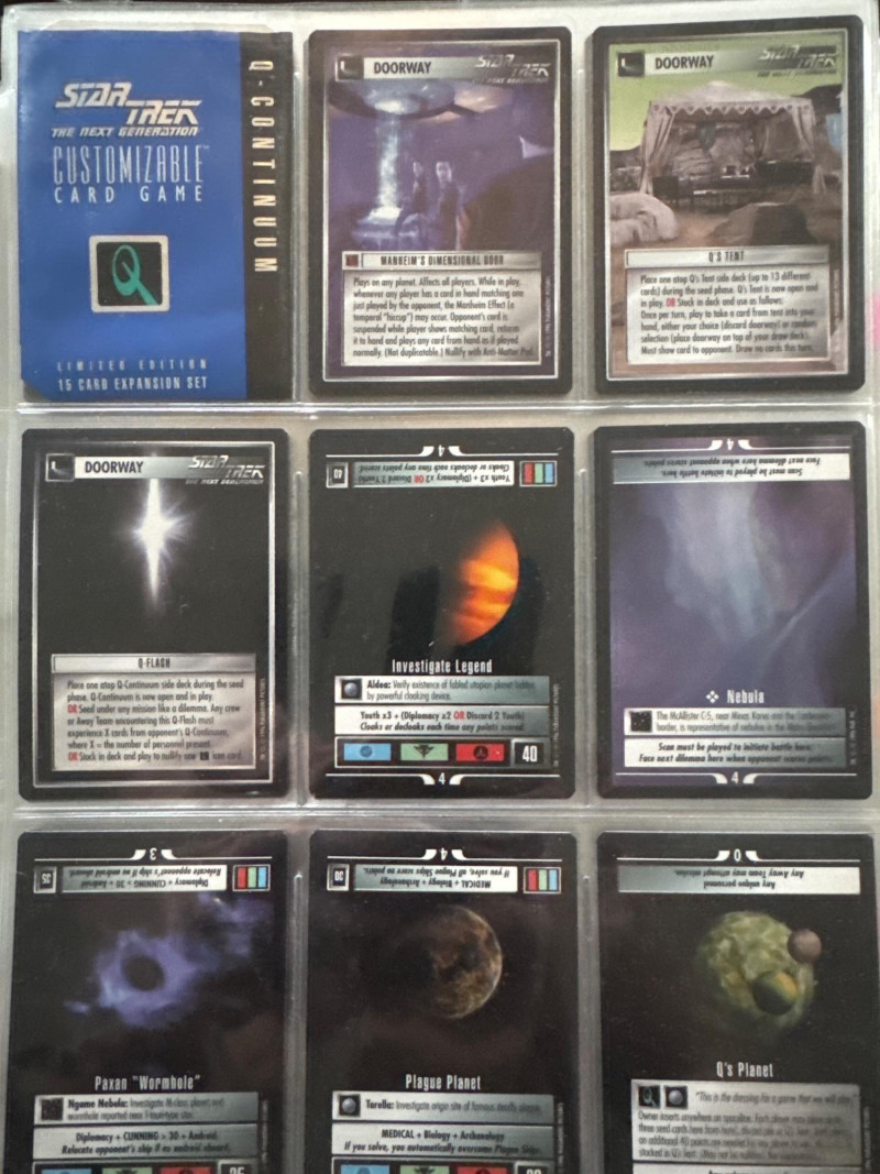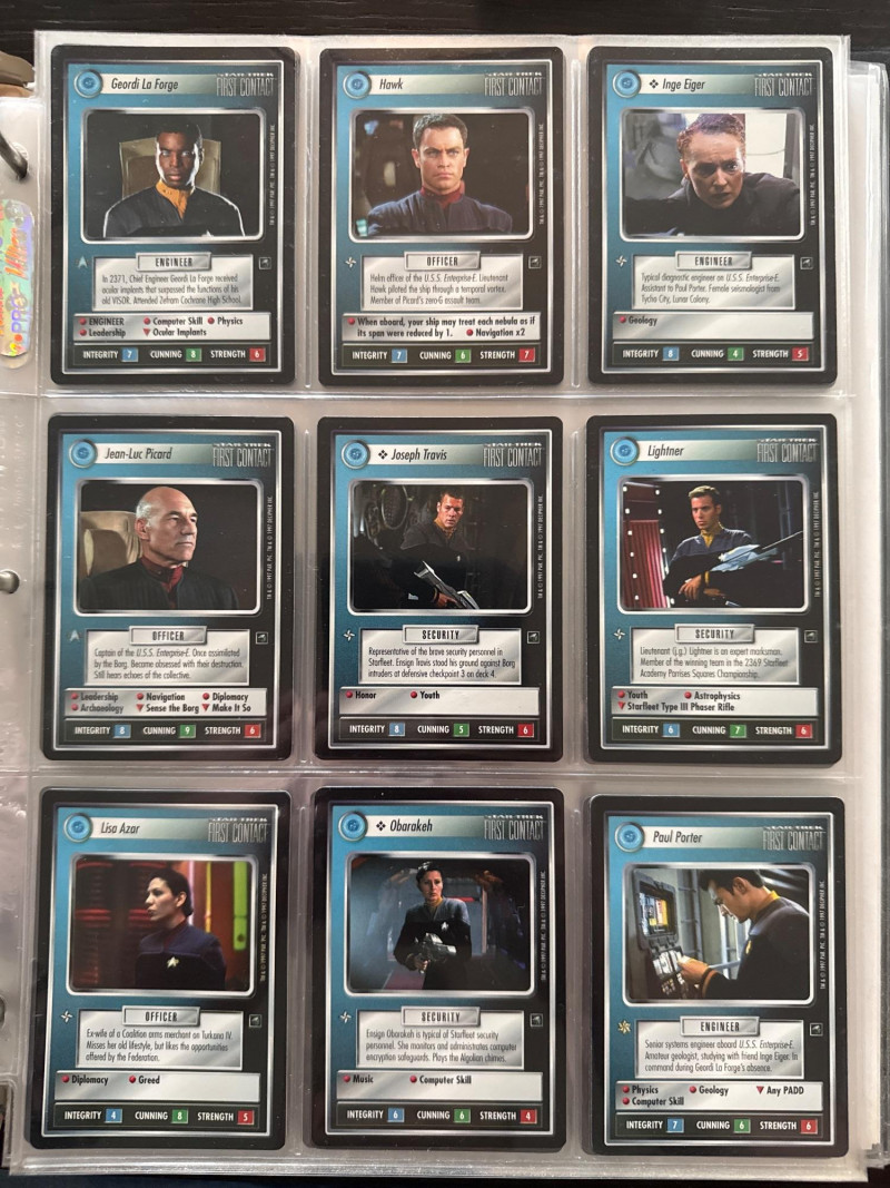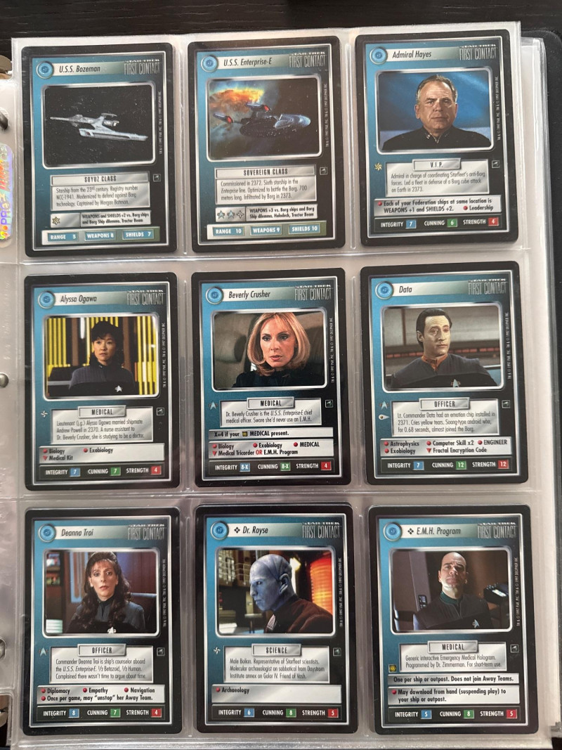 Star Trek customizable card game (CCG) in a collectors album. This album includes the following collections: Q-Continuum Black Boarder 1996 complete, Introductory Two-Player Game Black and White Boarder 1996 Complete Set, Fajo Collection Black Boarder 1997 complete, First Contact 1997 Black Boarder Complete.These collections include some rare and ultra rare cards. The cards are in near Mint condition. It does not look like they were ever used