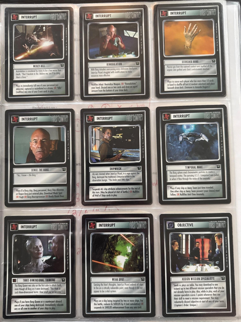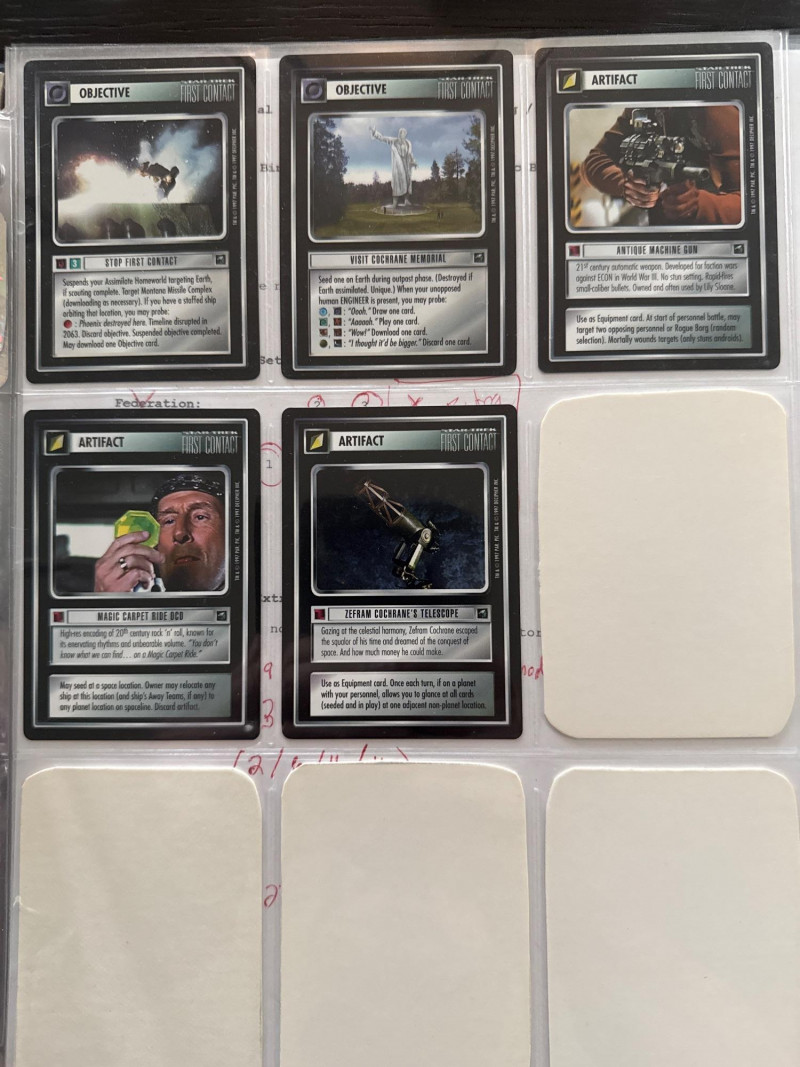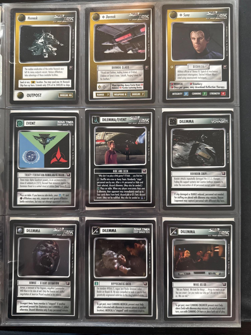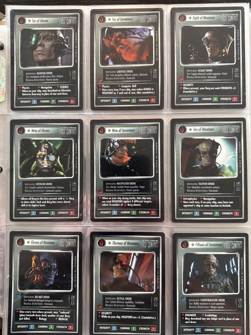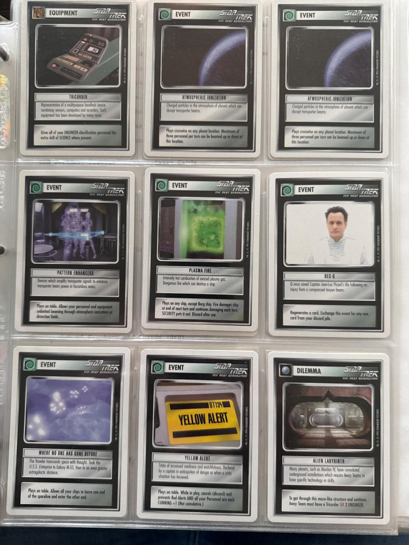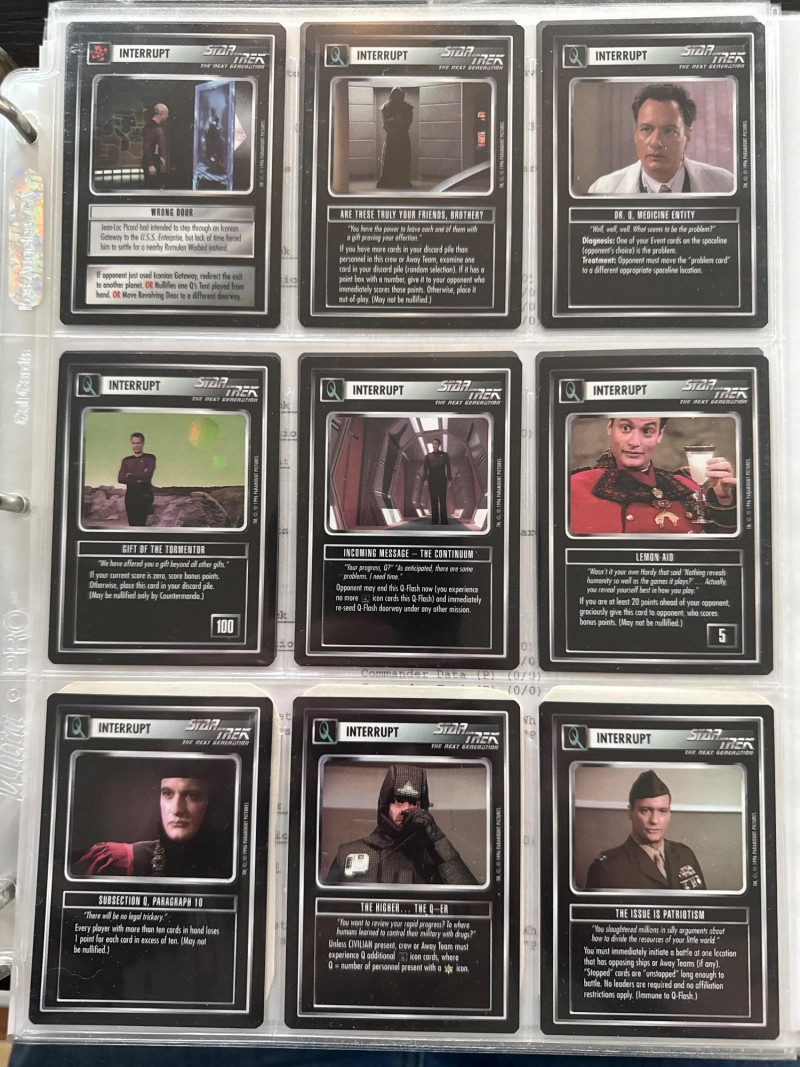 Star Trek customizable card game (CCG) in a collectors album. This album includes the following collections: Q-Continuum Black Boarder 1996 complete, Introductory Two-Player Game Black and White Boarder 1996 Complete Set, Fajo Collection Black Boarder 1997 complete, First Contact 1997 Black Boarder Complete.These collections include some rare and ultra rare cards. The cards are in near Mint condition. It does not look like they were ever used
