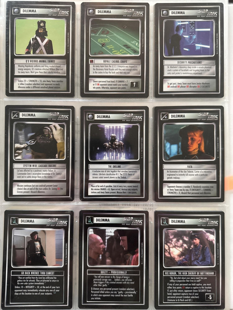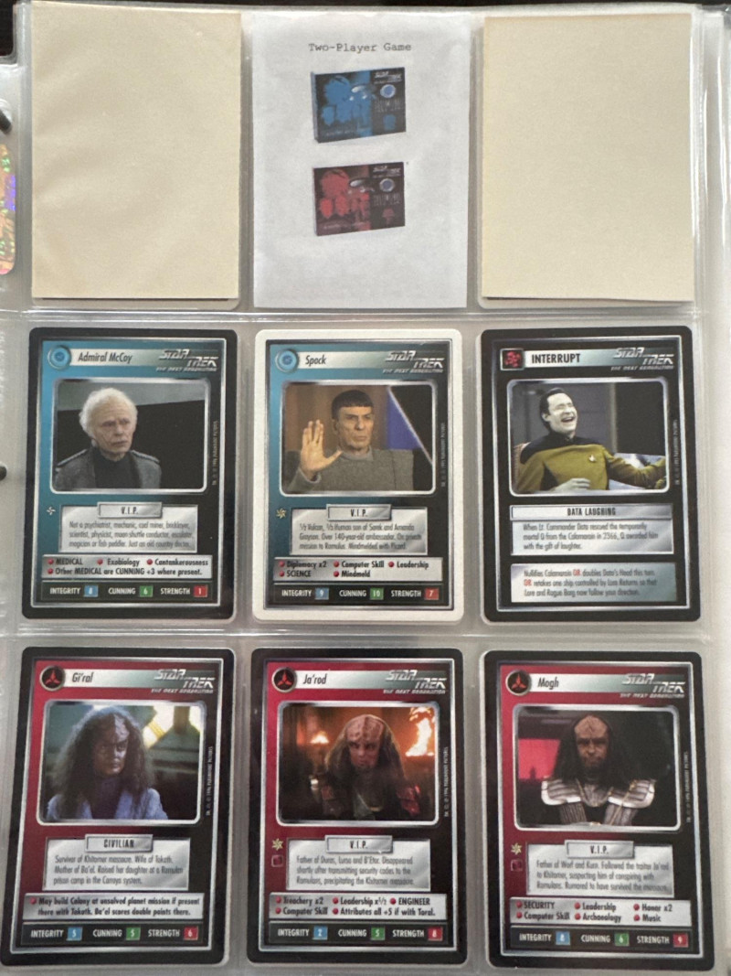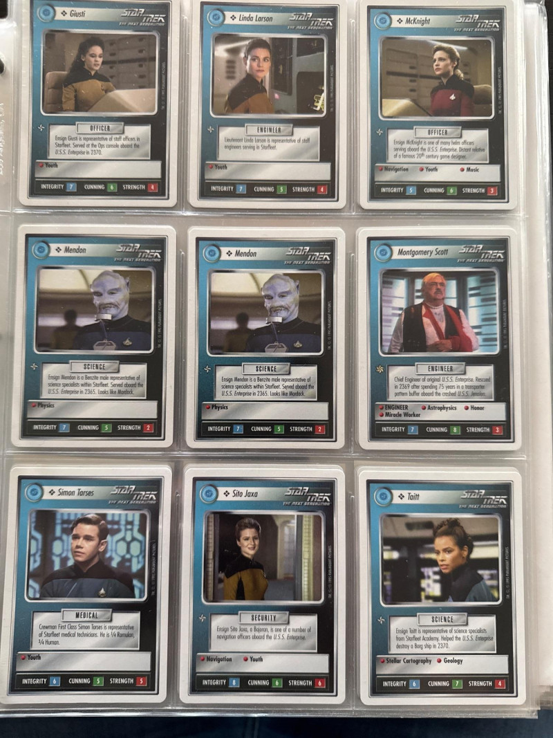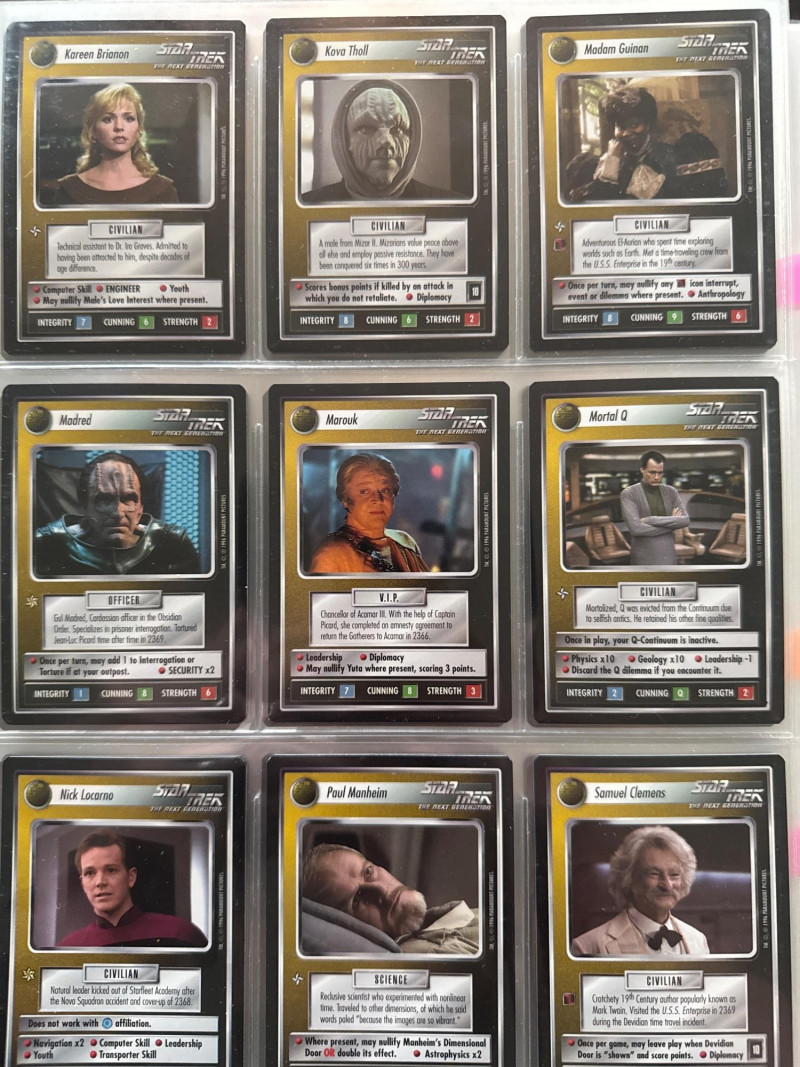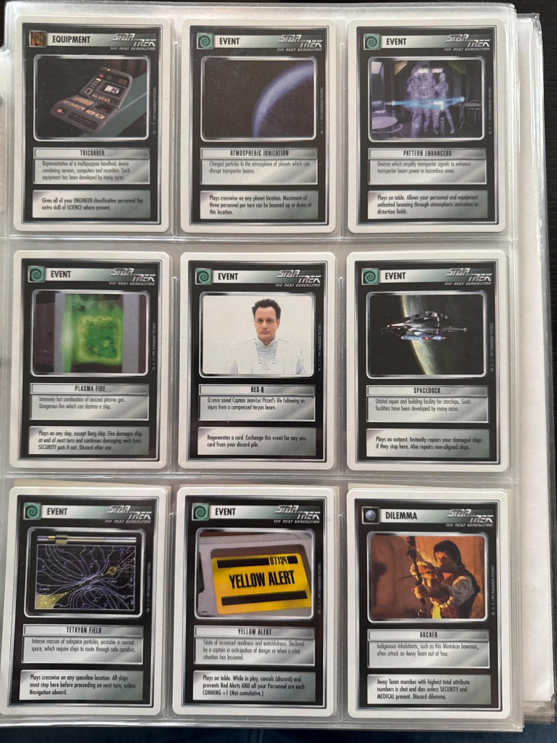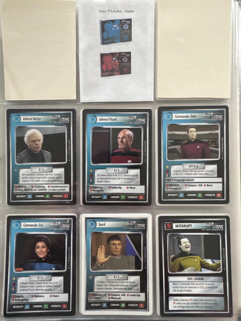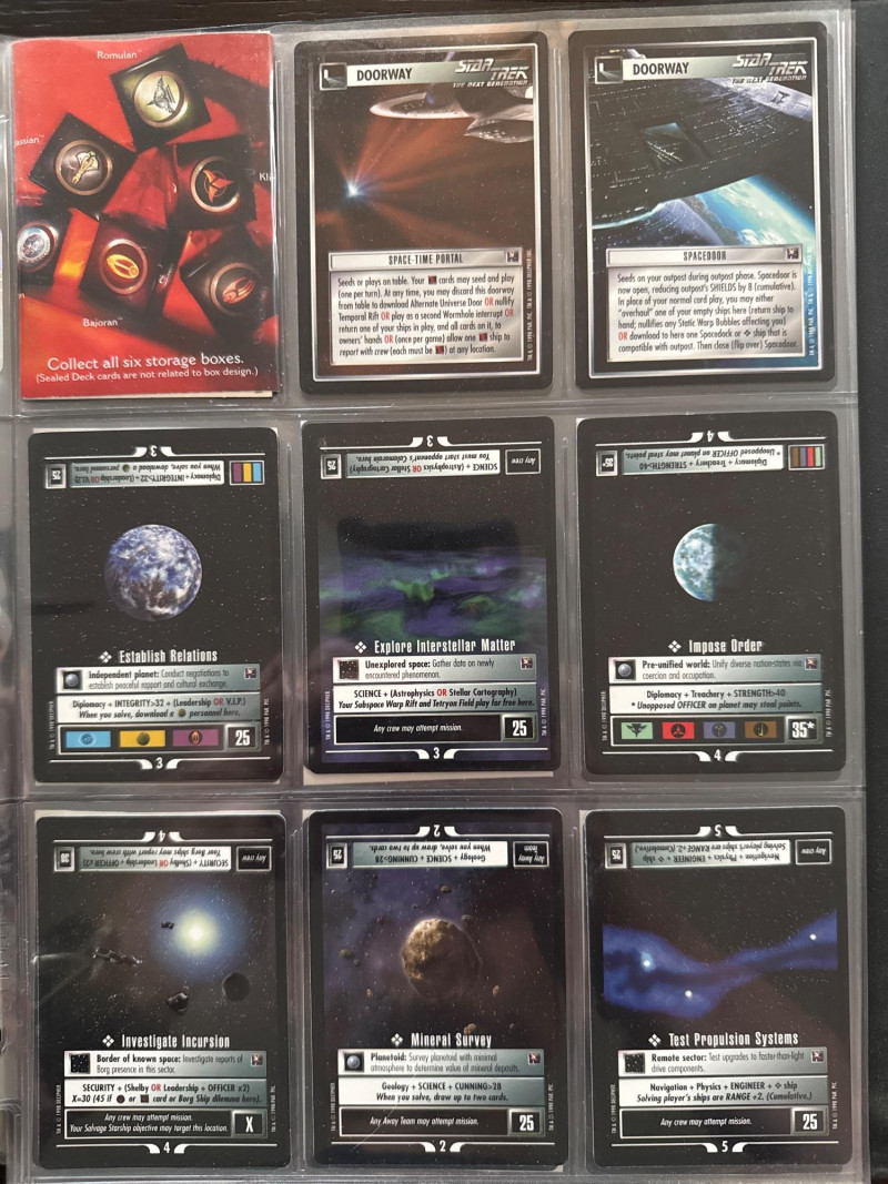 Star Trek customizable card game (CCG) in a collectors album. This album includes the following collections: Q-Continuum Black Boarder 1996 complete, Introductory Two-Player Game Black and White Boarder 1996 Complete Set, Fajo Collection Black Boarder 1997 complete, First Contact 1997 Black Boarder Complete.These collections include some rare and ultra rare cards. The cards are in near Mint condition. It does not look like they were ever used