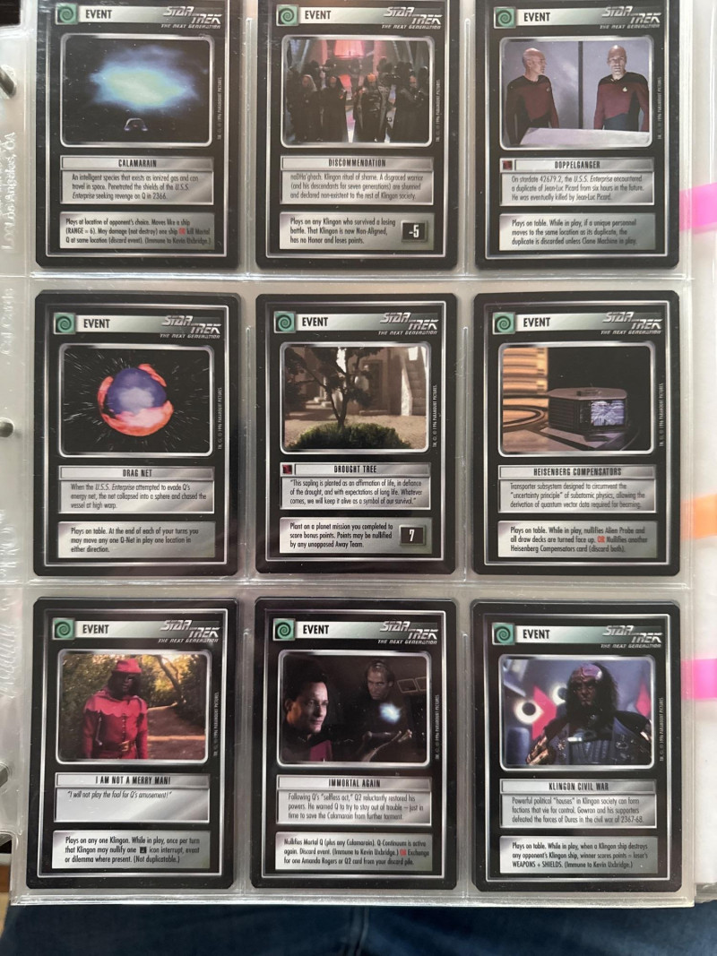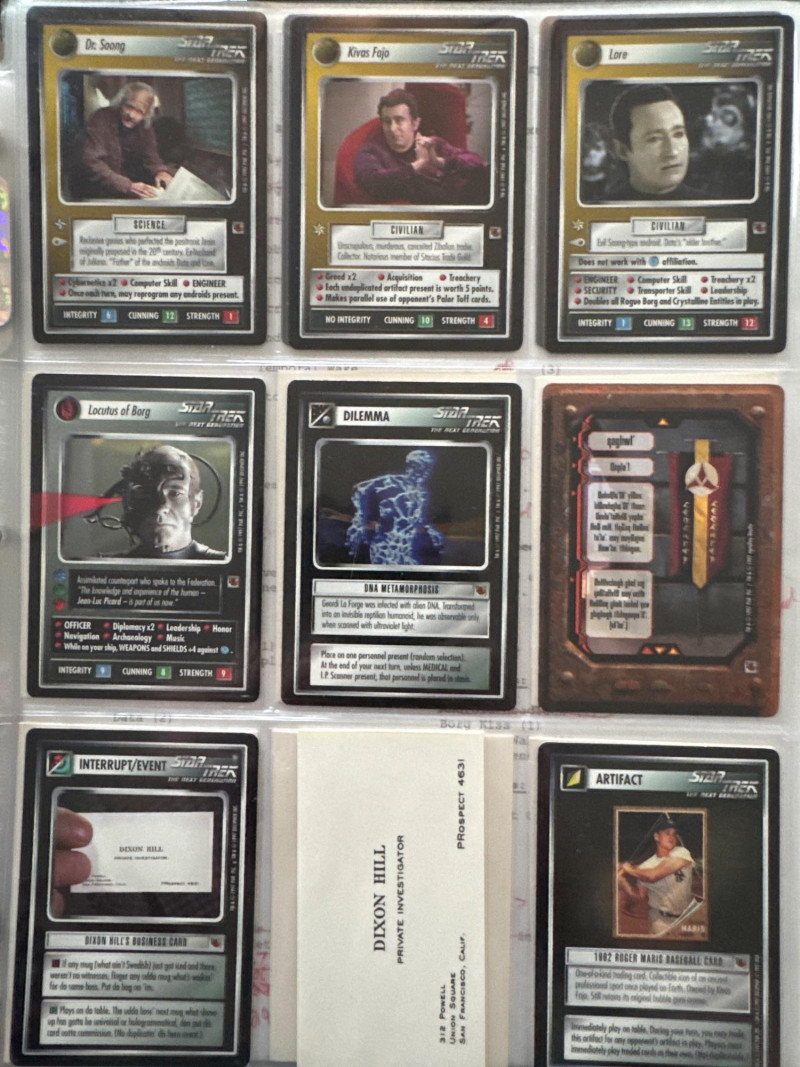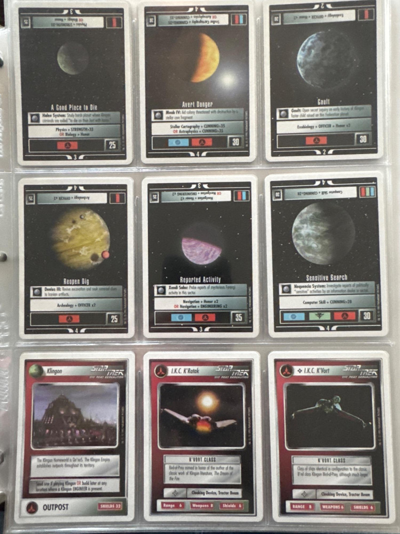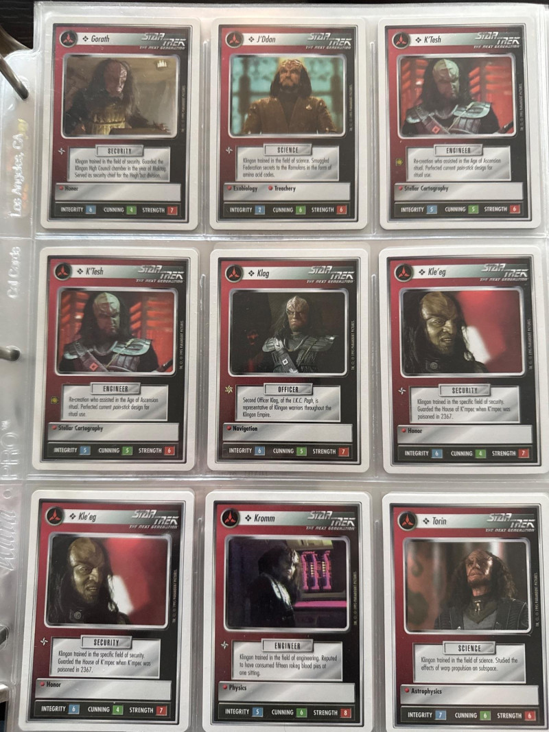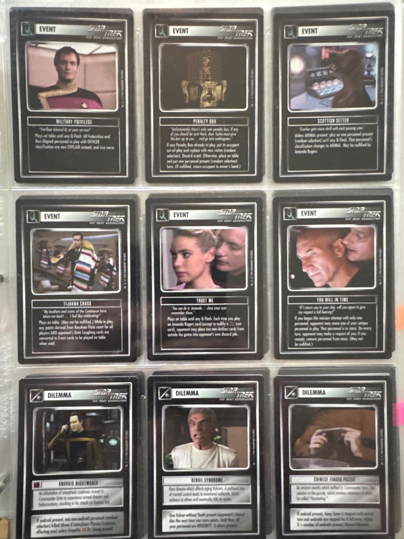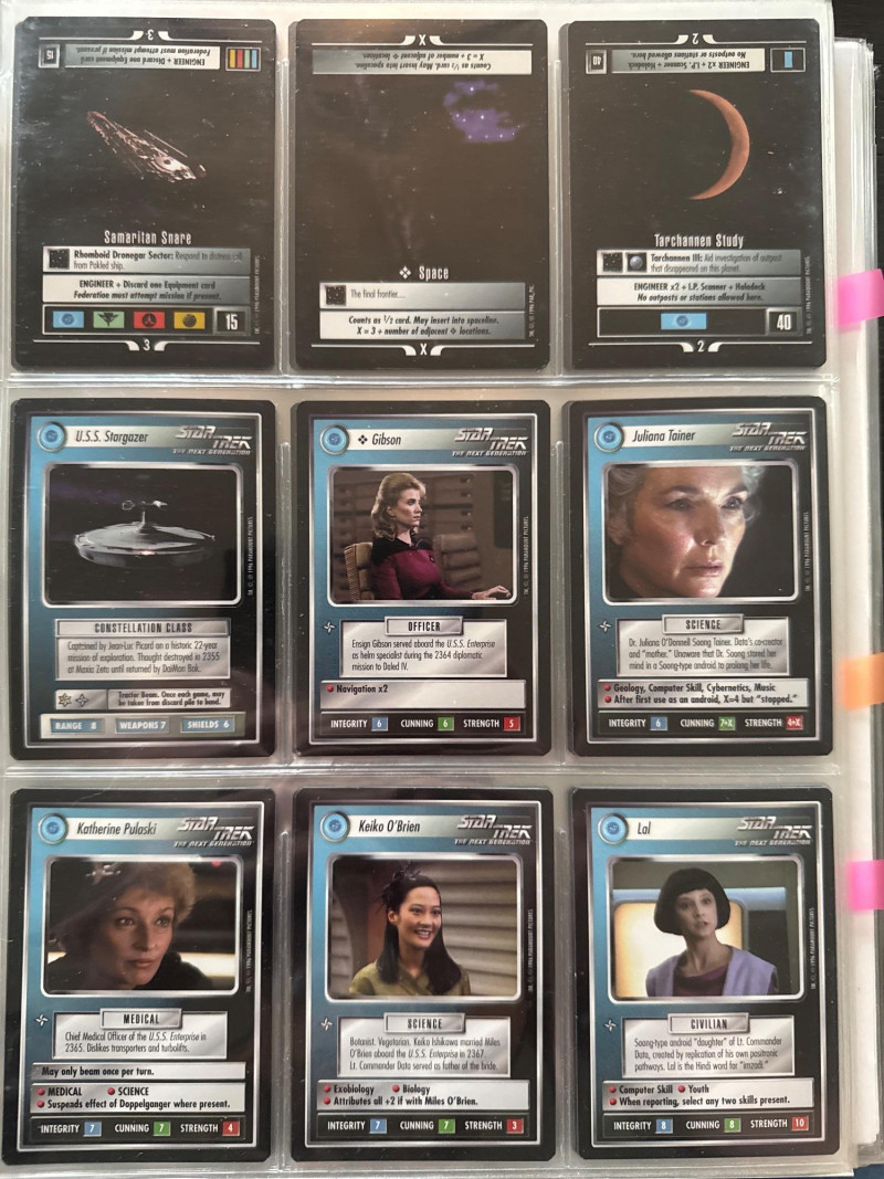 Star Trek customizable card game (CCG) in a collectors album. This album includes the following collections: Q-Continuum Black Boarder 1996 complete, Introductory Two-Player Game Black and White Boarder 1996 Complete Set, Fajo Collection Black Boarder 1997 complete, First Contact 1997 Black Boarder Complete.These collections include some rare and ultra rare cards. The cards are in near Mint condition. It does not look like they were ever used