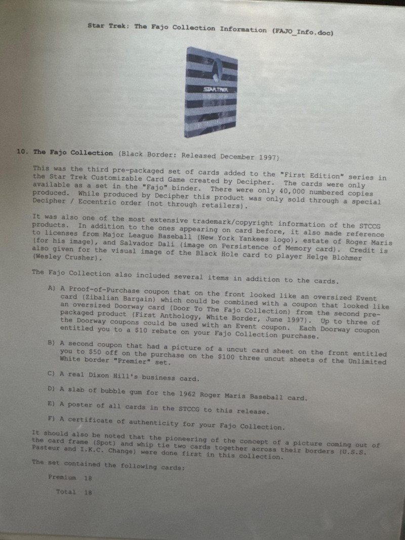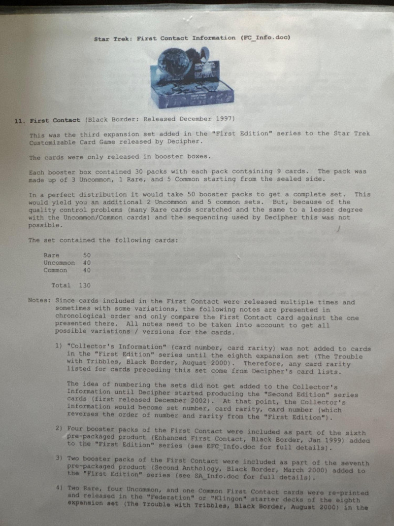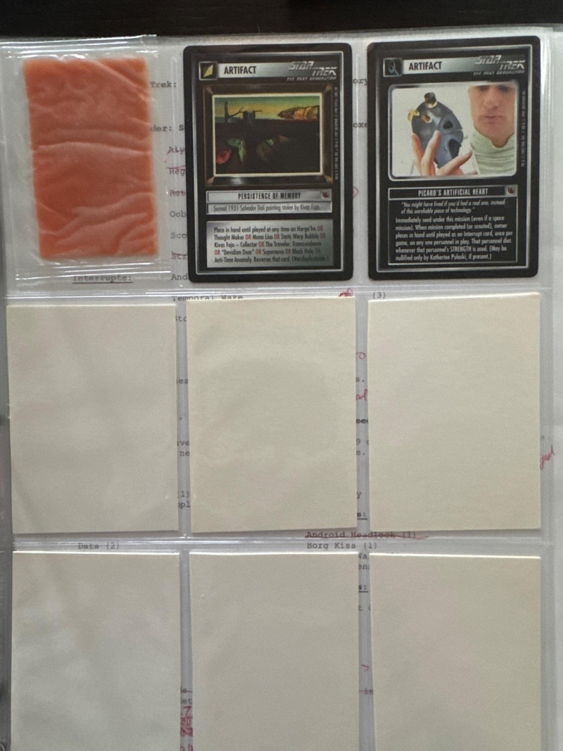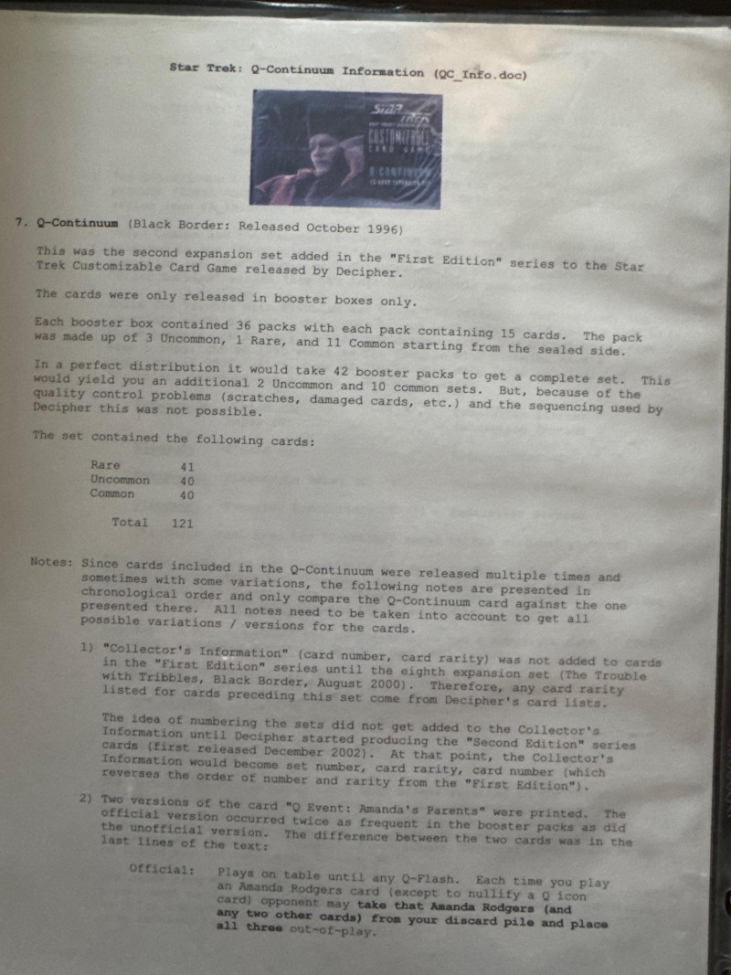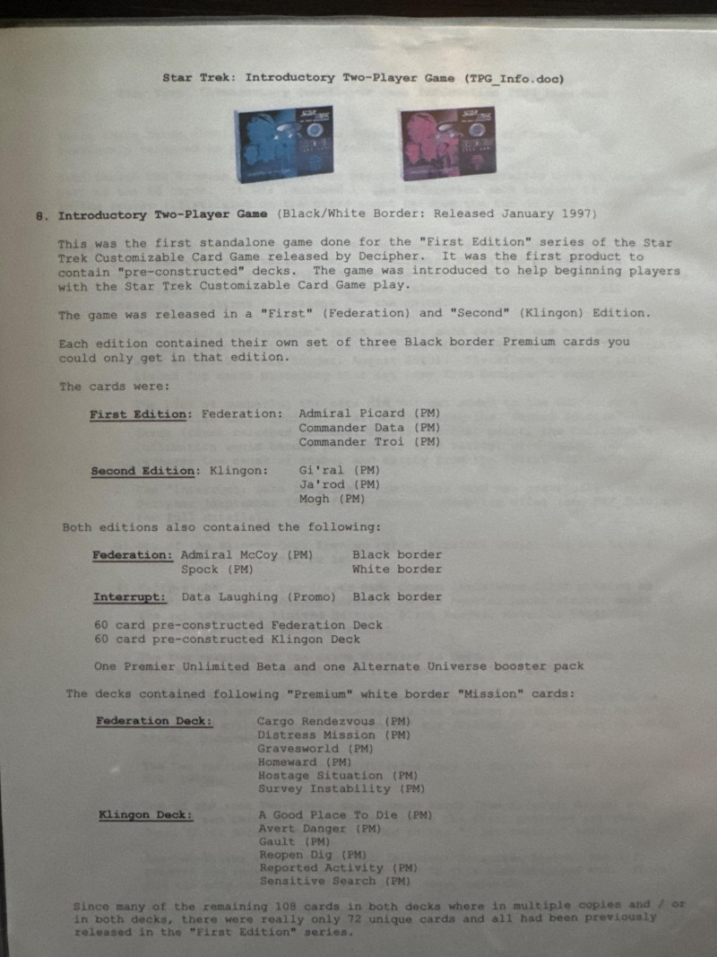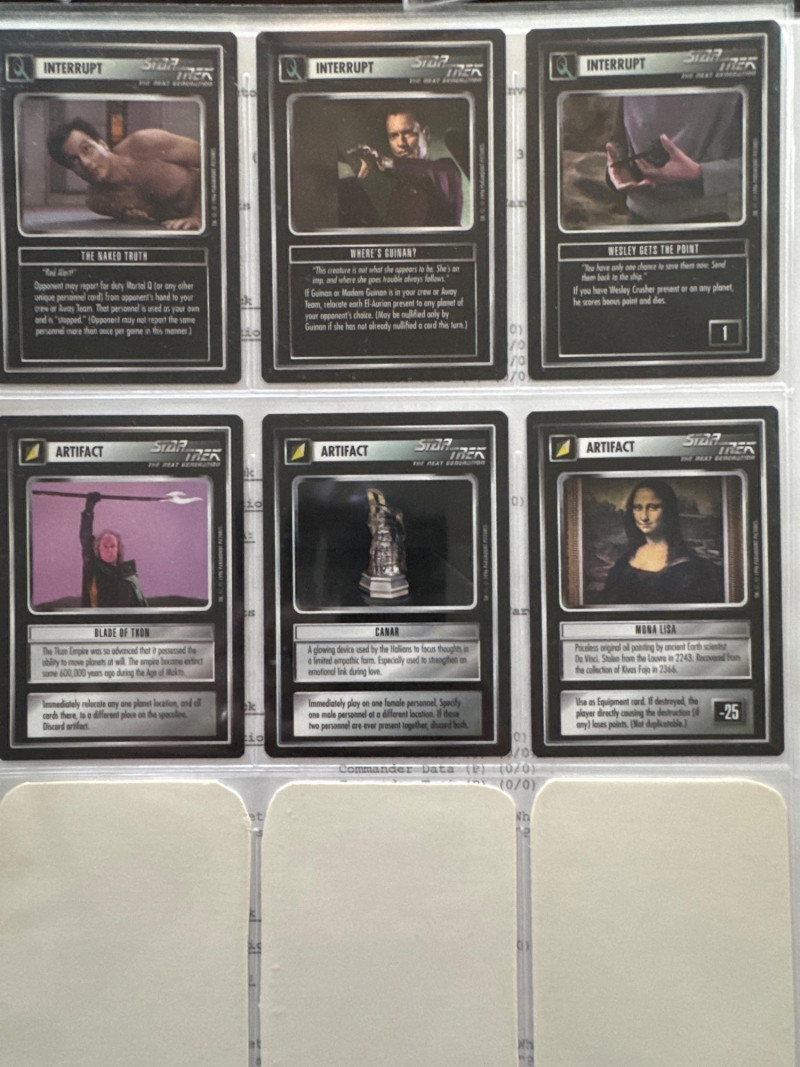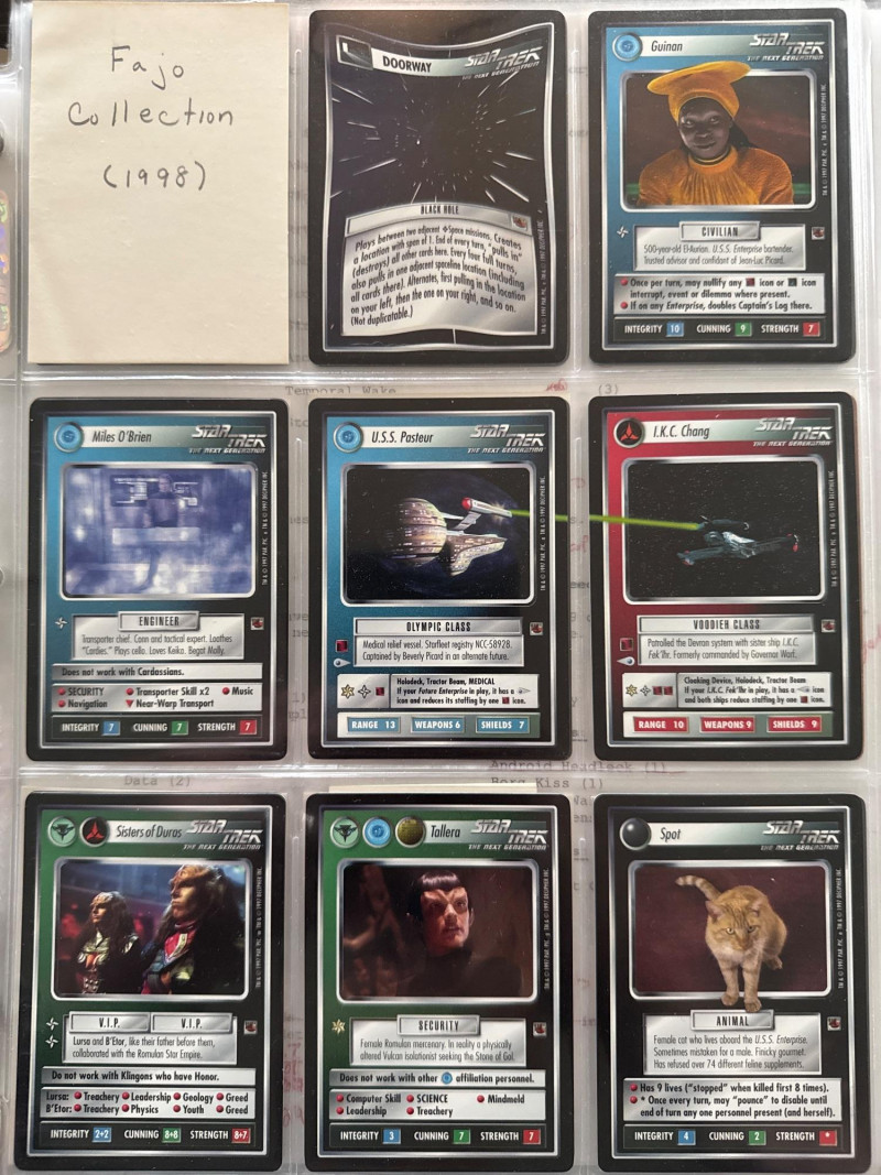 Star Trek customizable card game (CCG) in a collectors album. This album includes the following collections: Q-Continuum Black Boarder 1996 complete, Introductory Two-Player Game Black and White Boarder 1996 Complete Set, Fajo Collection Black Boarder 1997 complete, First Contact 1997 Black Boarder Complete.These collections include some rare and ultra rare cards. The cards are in near Mint condition. It does not look like they were ever used