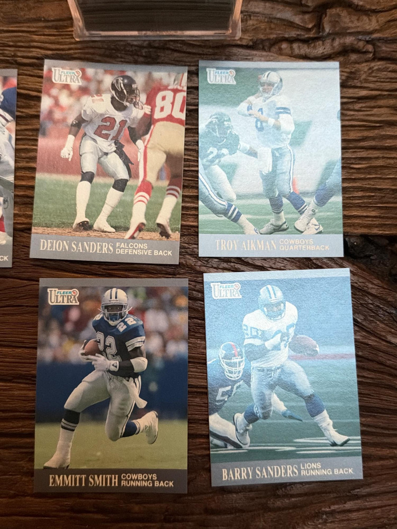 Collection of 1991 Fleer Ultra NFL cards, including cards numbered 1–99, with several standout star players pulled and highlighted.