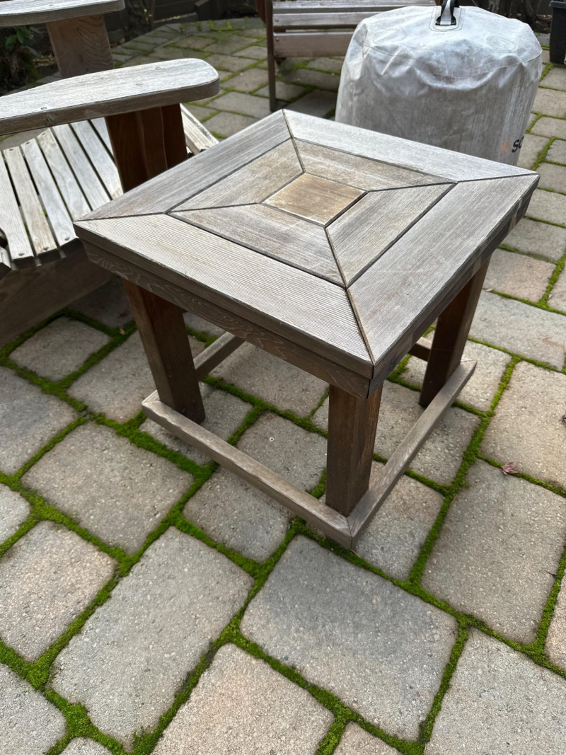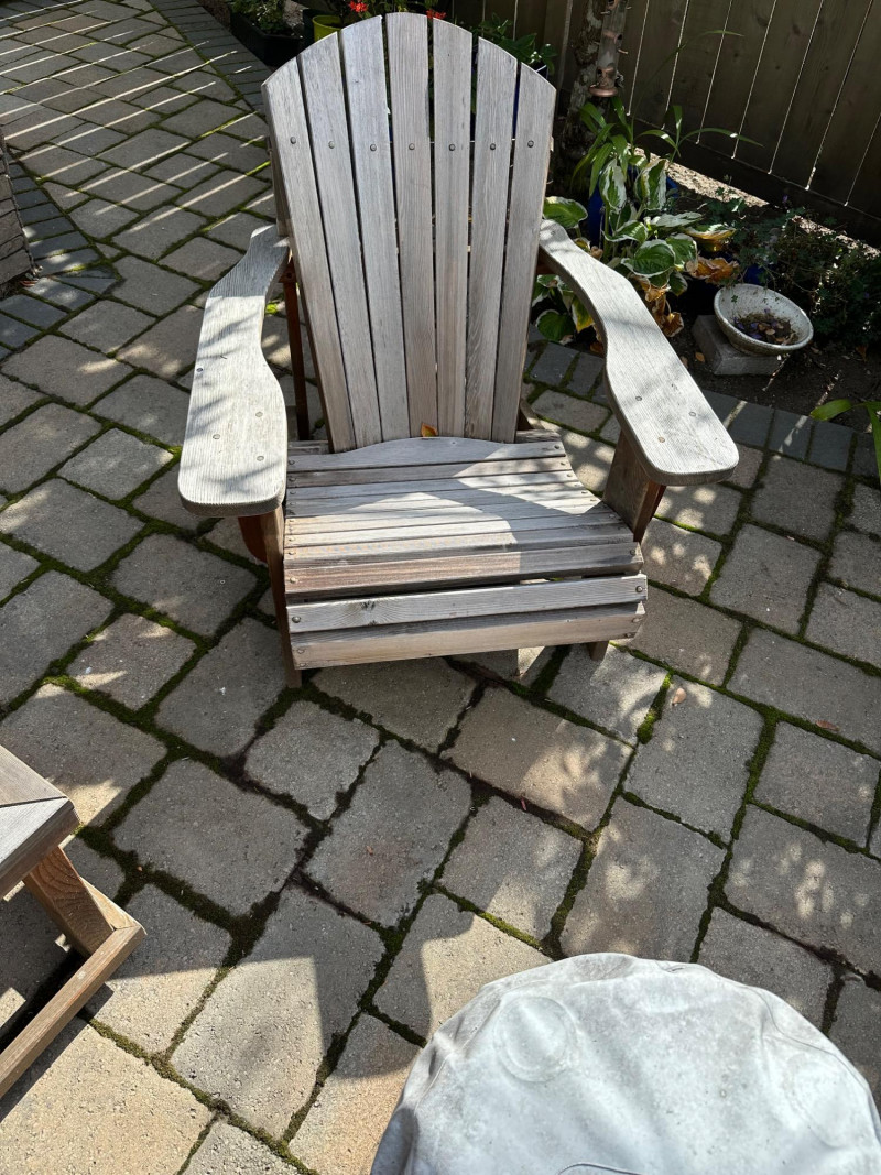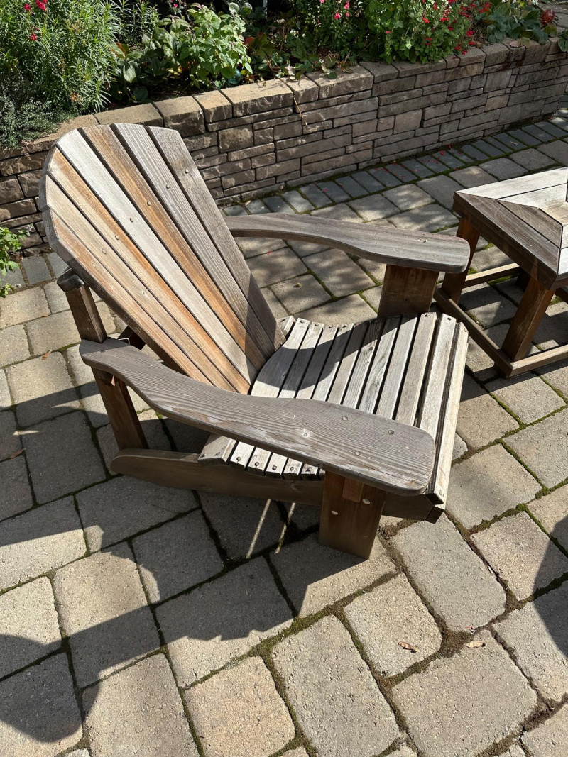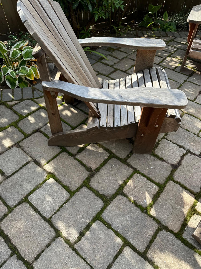 Set includes cedar Adirondack chairs and matching side table, all in good condition.