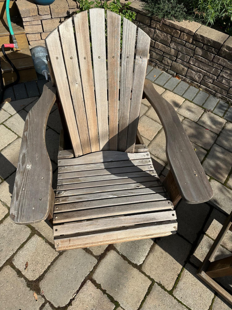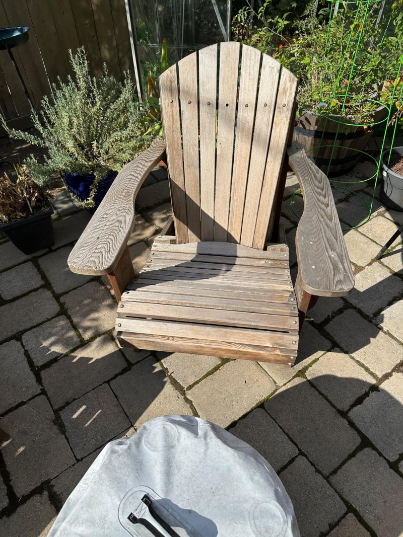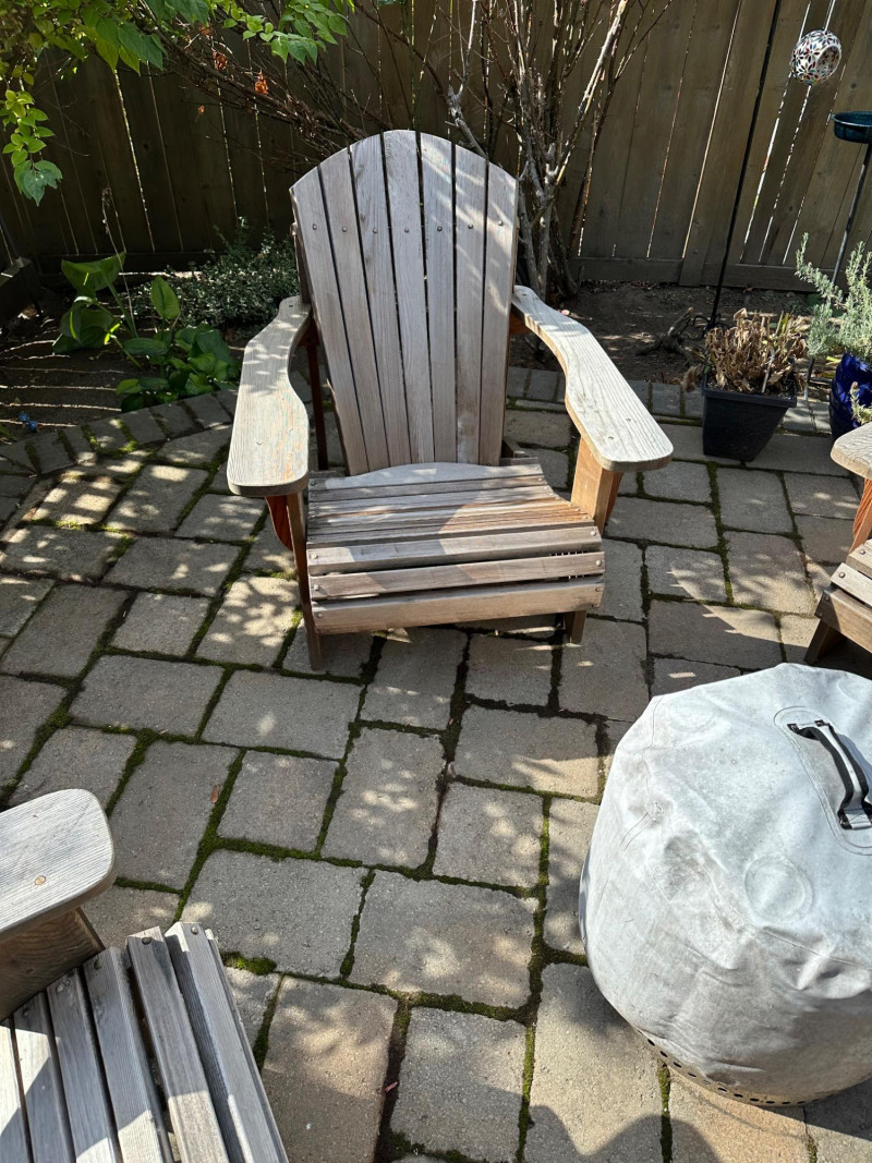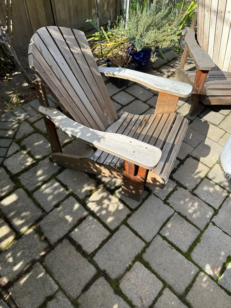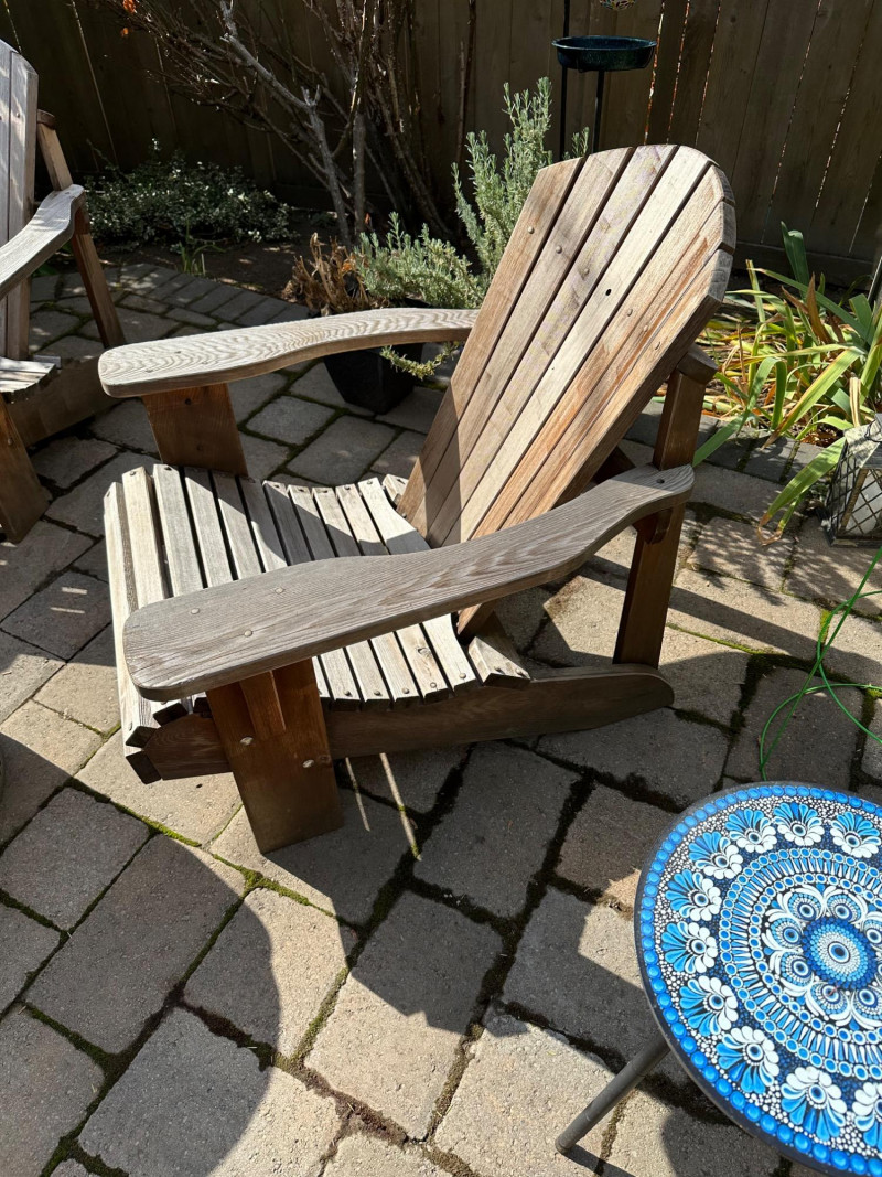 Set includes cedar Adirondack chairs and matching side table, all in good condition.