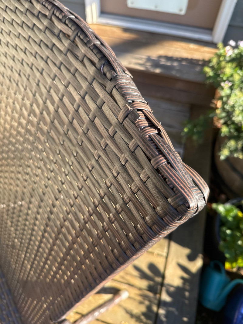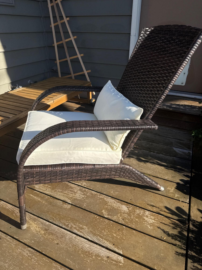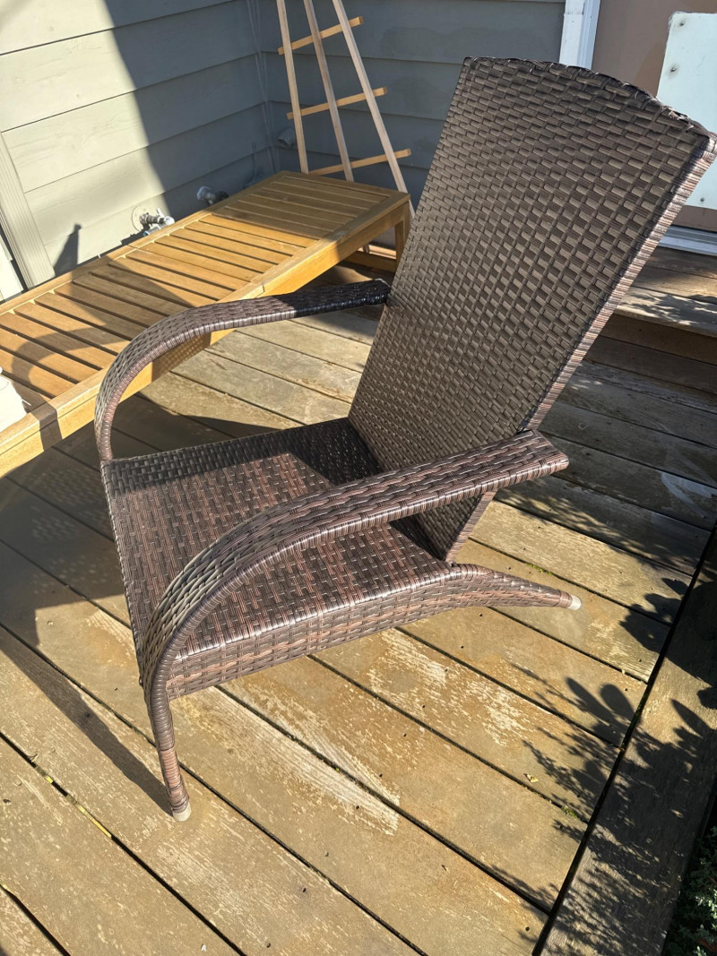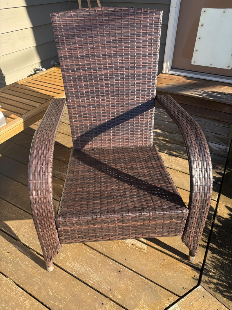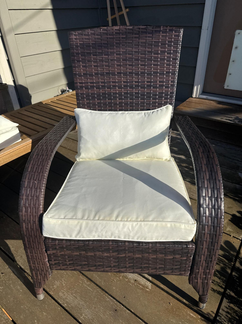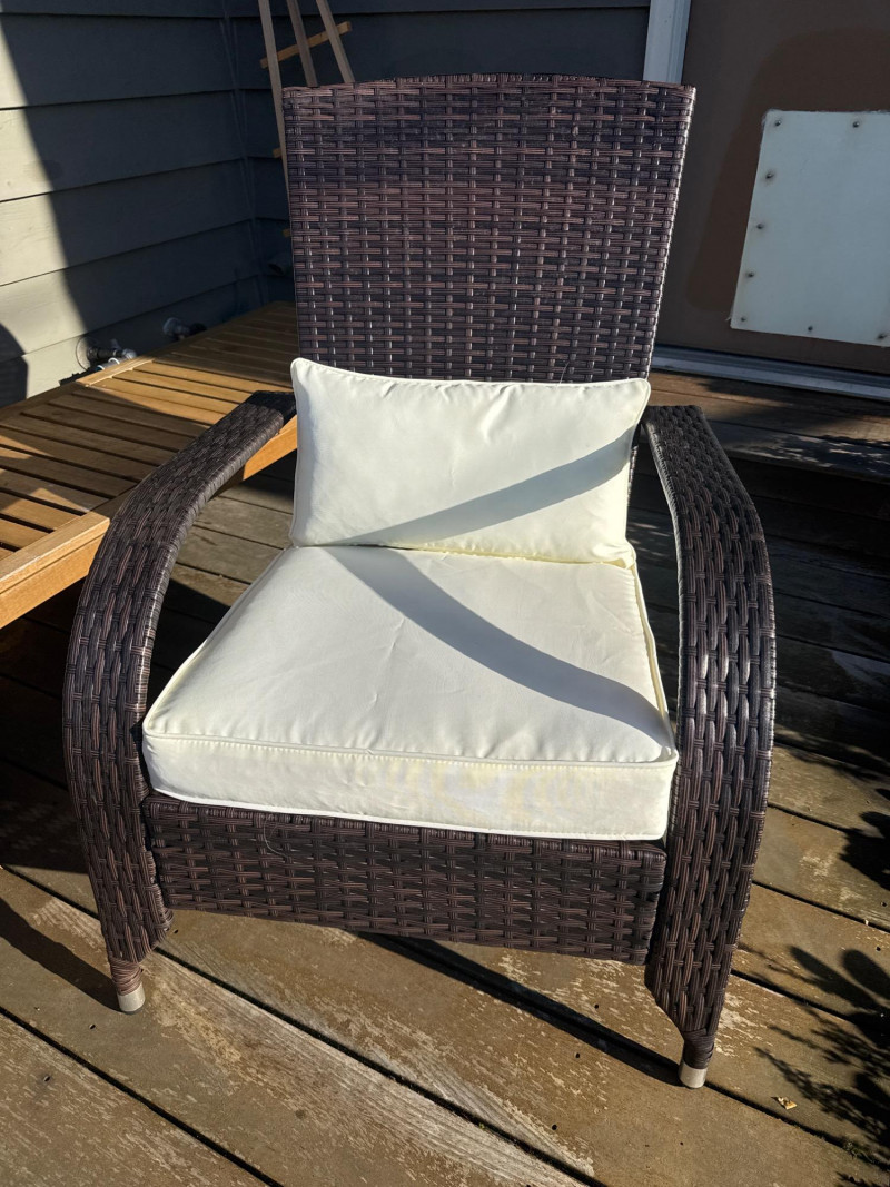 Patio Wicker Adirondack Chair, Outdoor All-Weather Rattan Fire Pit Chair w/ Soft Cushions, Tall Curved Backrest and Comfortable Armrests for Deck or Garden, Cream White One of them has a couple of bands that are cut, see photo. This has not caused any issues for functionality.
