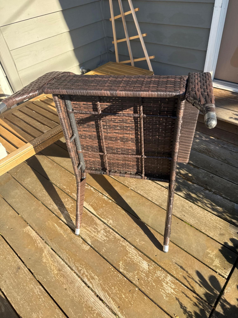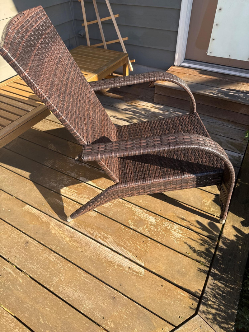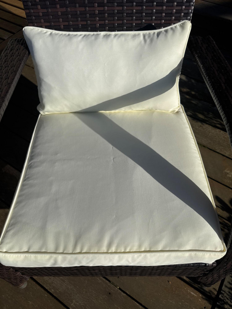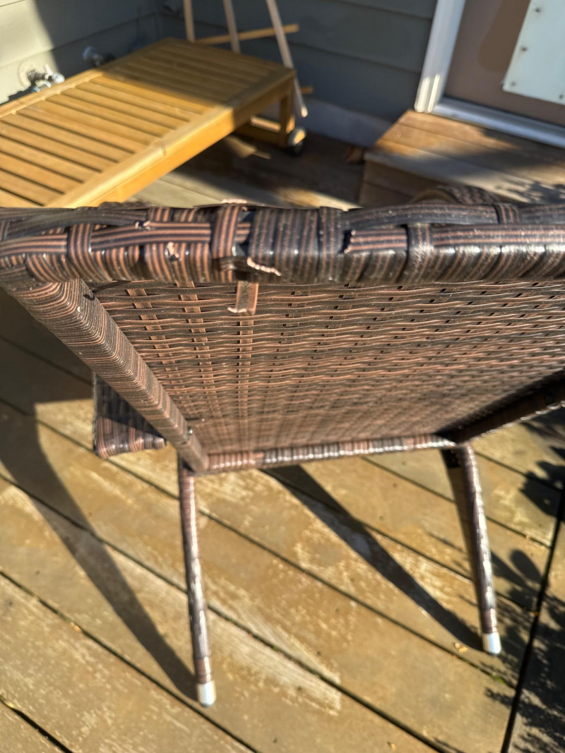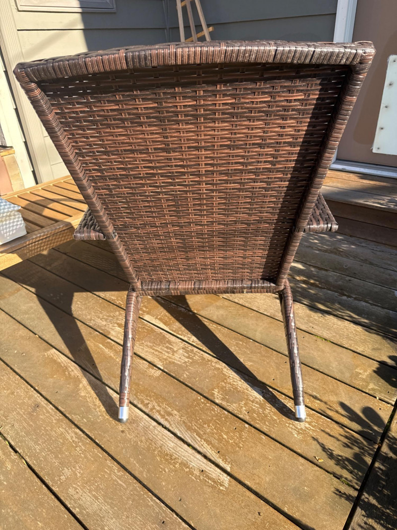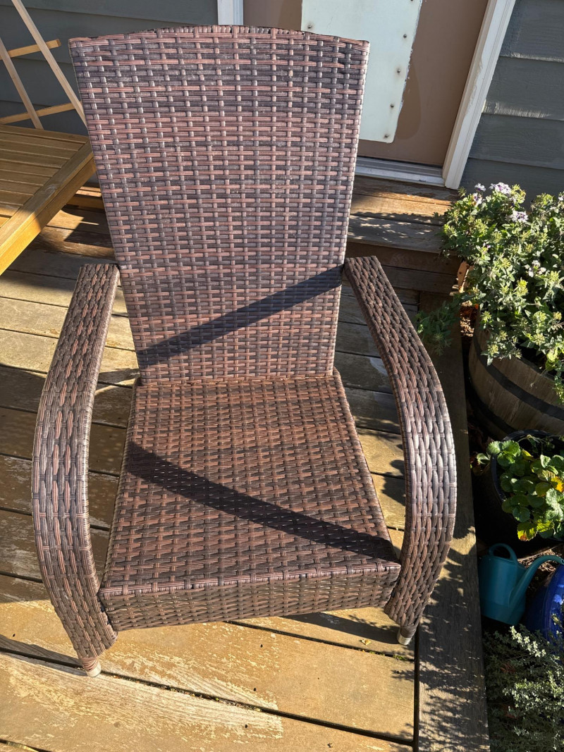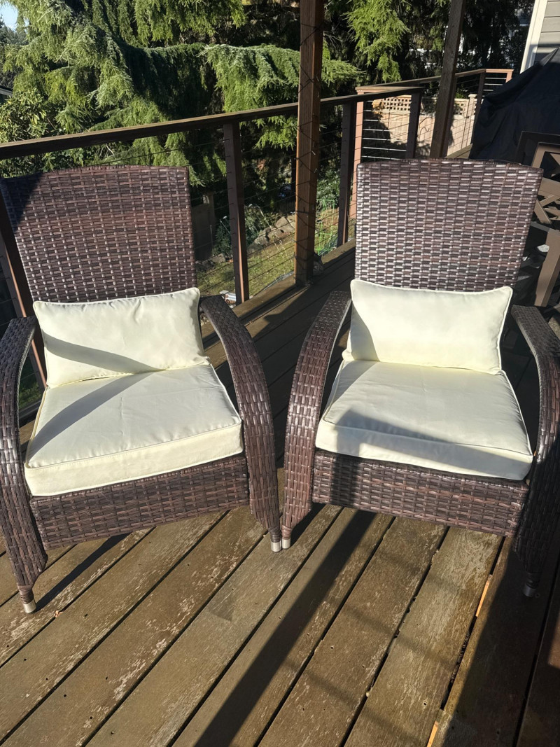 Patio Wicker Adirondack Chair, Outdoor All-Weather Rattan Fire Pit Chair w/ Soft Cushions, Tall Curved Backrest and Comfortable Armrests for Deck or Garden, Cream White One of them has a couple of bands that are cut, see photo. This has not caused any issues for functionality.