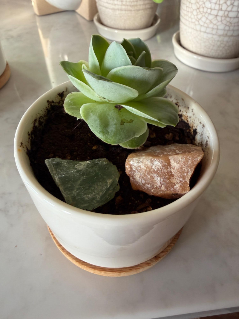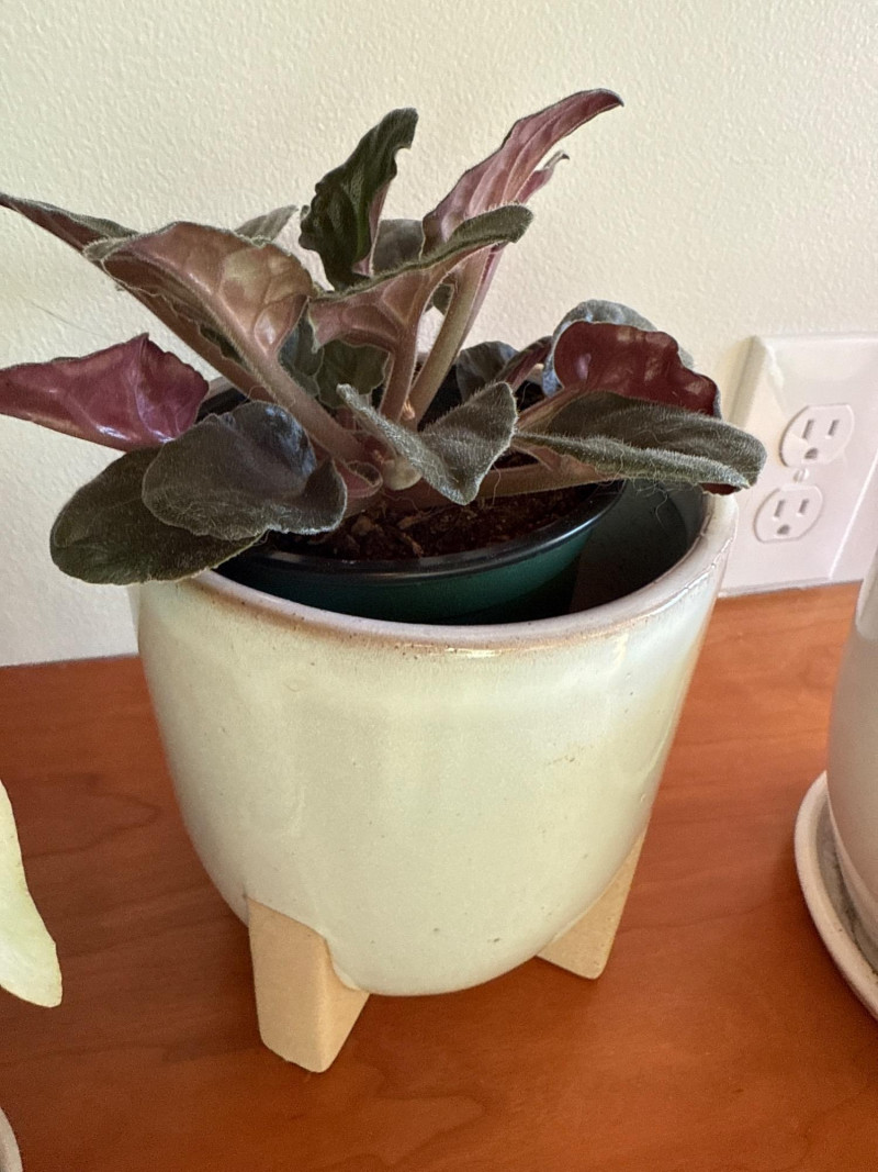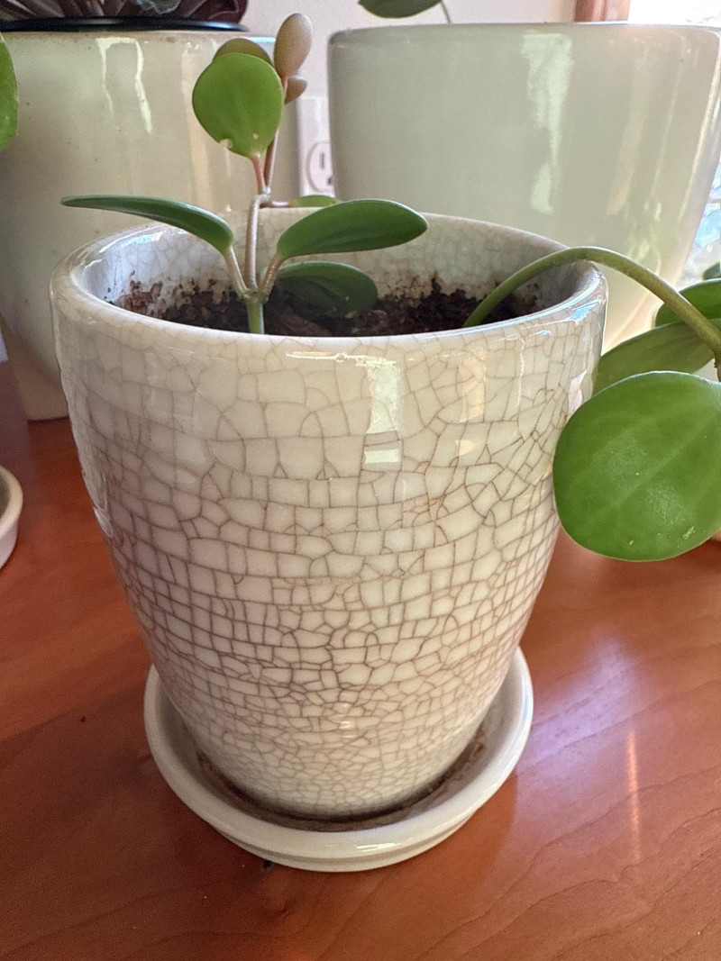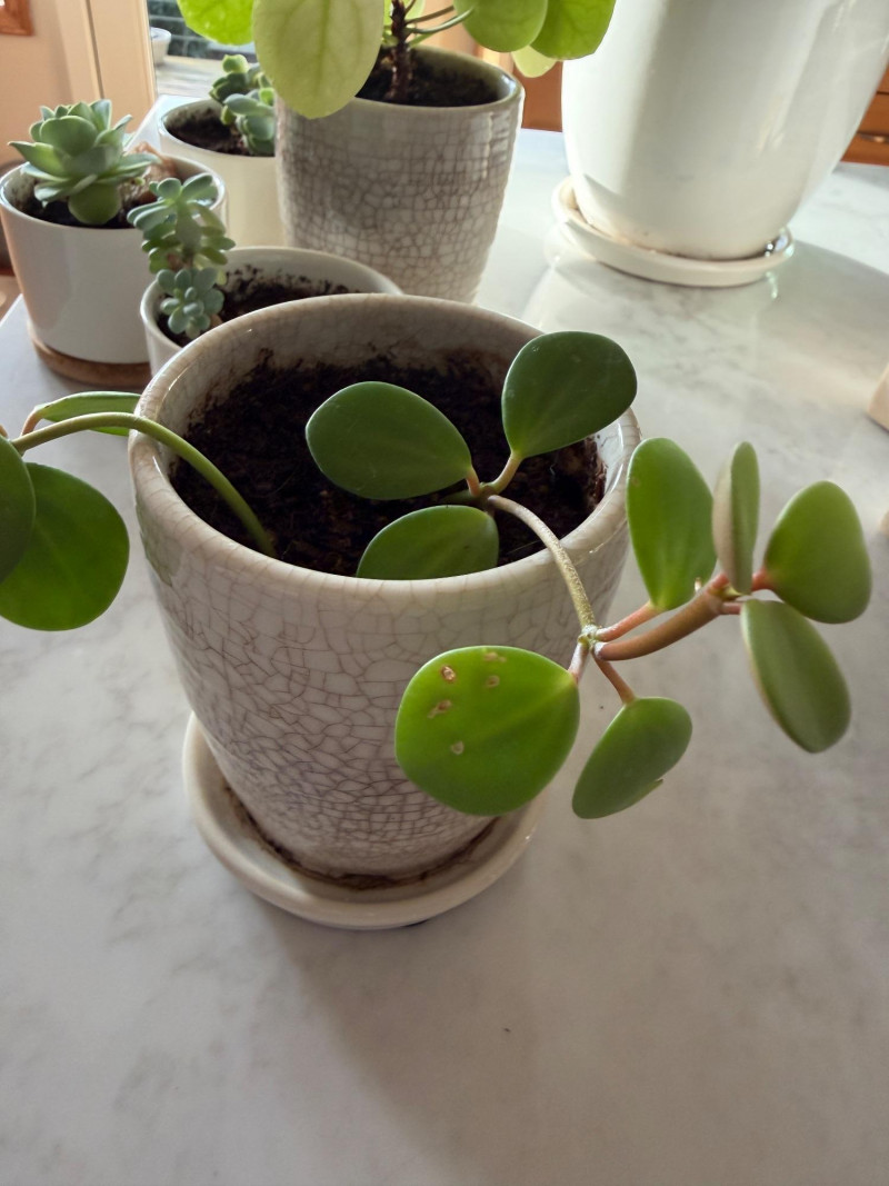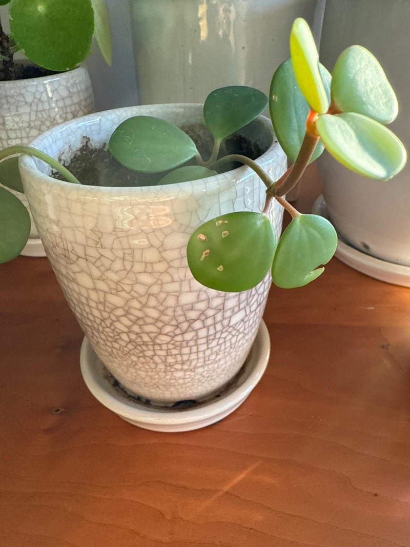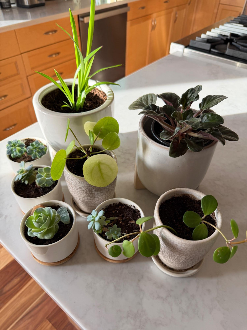Assorted live plants in ceramic pots: spider plant, money plant, african violet, and succulents: All plants and pots are in good condition.