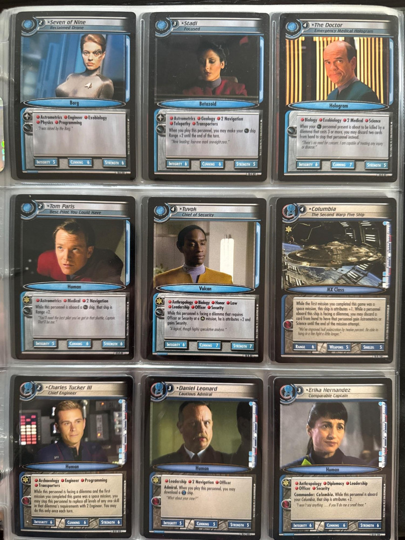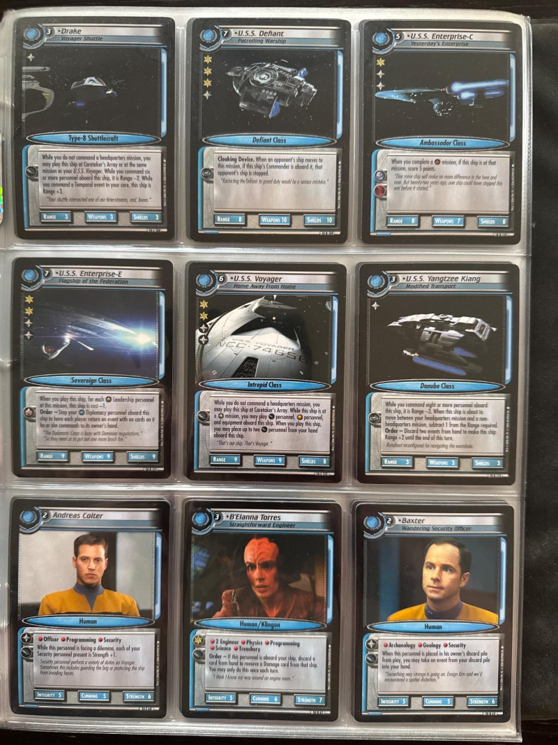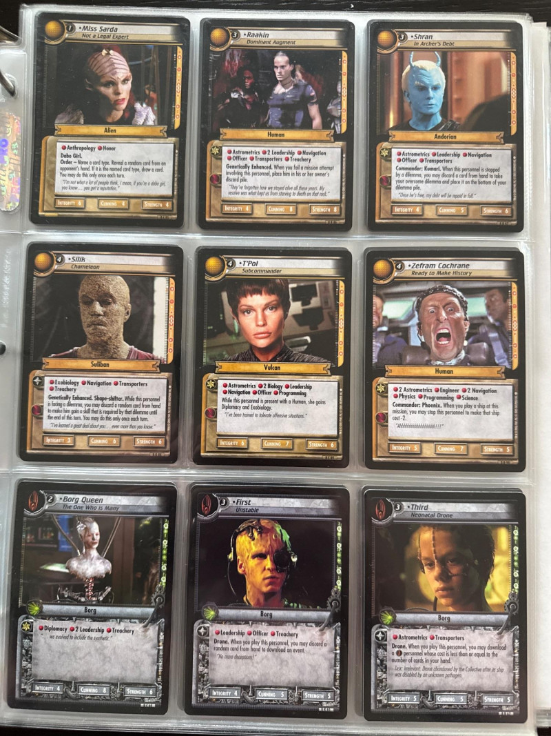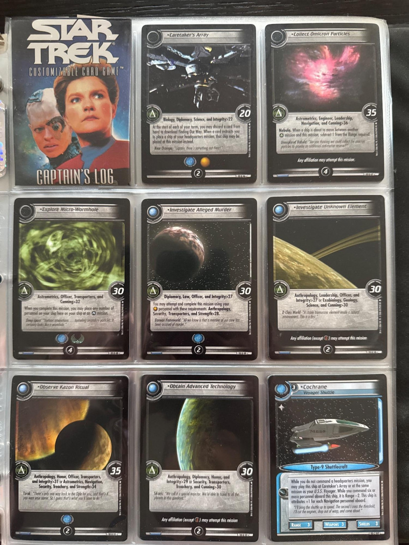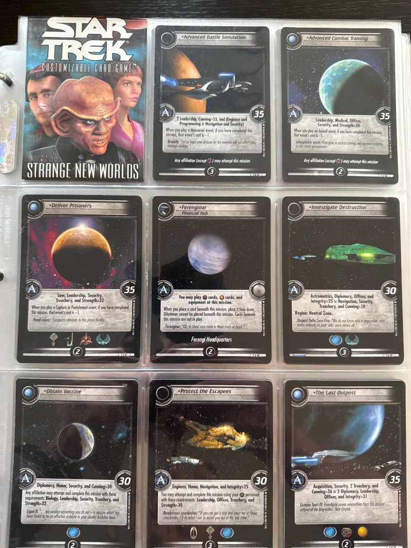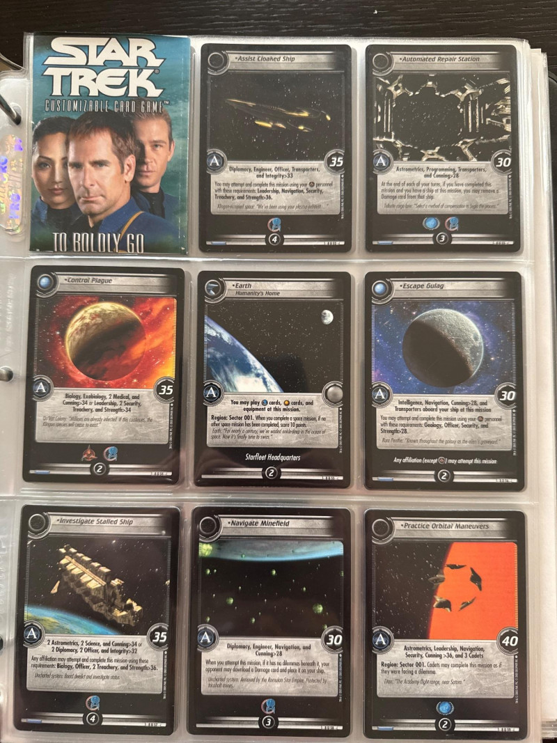 Star Trek customizable card game (CCG) in a collectors album. This album includes the following collections: Strange New Worlds, adversaries’s anthology information (Includes Premium card Queen Borg Cube), Enterprise Collection, To Boldly Go, Dangerous Missions, Captains Log. These collections include many rare cards. The cards are in near Mint condition. It does not look like they were ever used.