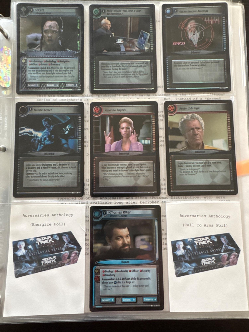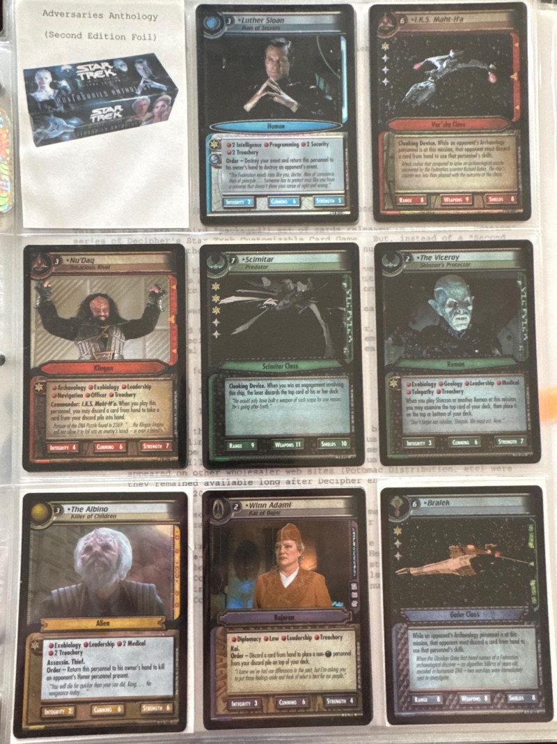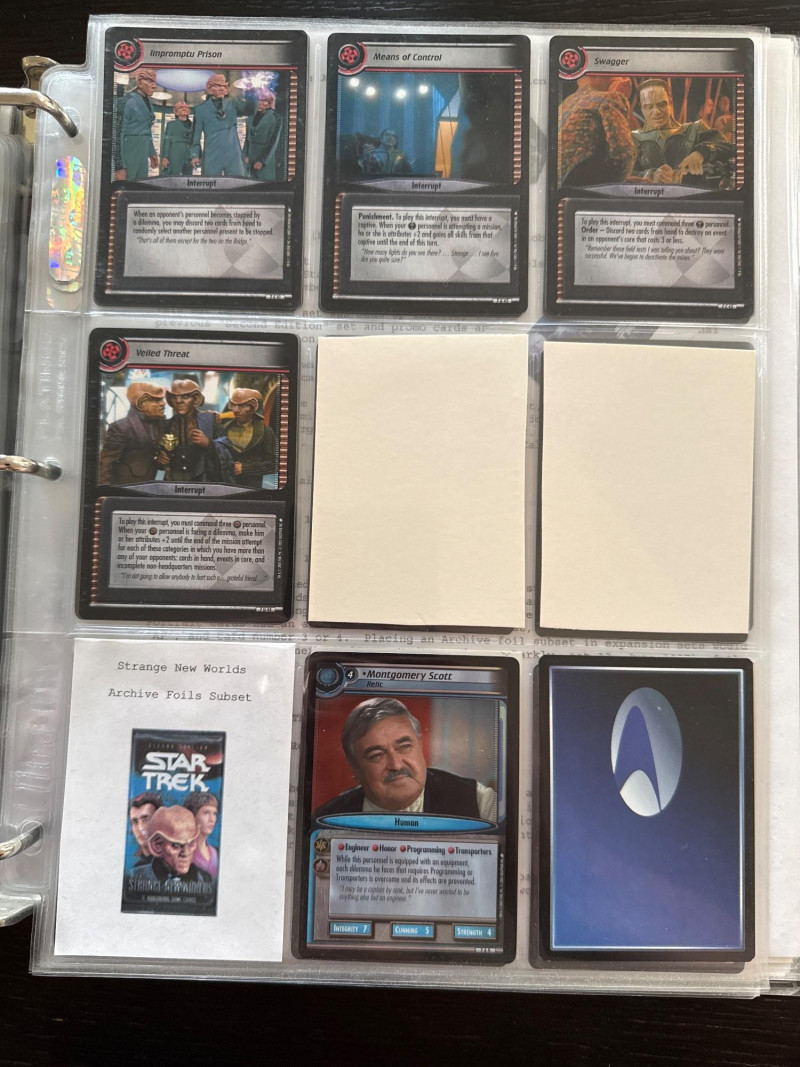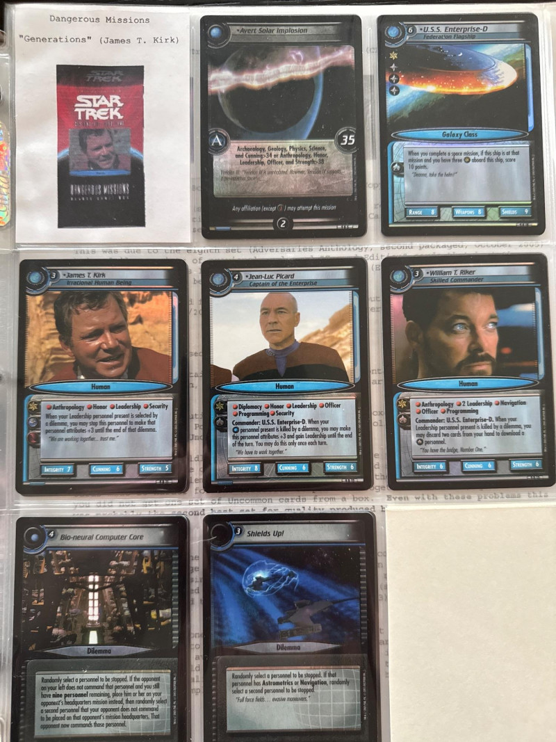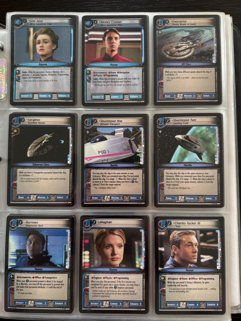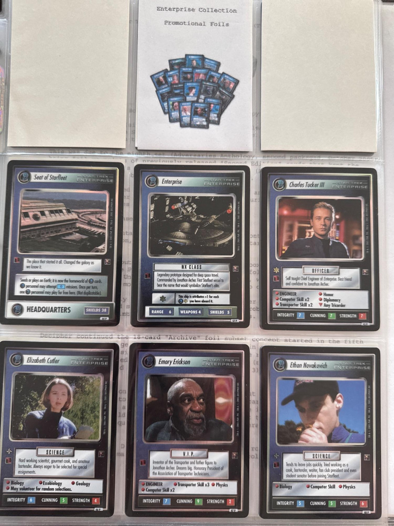 Star Trek customizable card game (CCG) in a collectors album. This album includes the following collections: Strange New Worlds, adversaries’s anthology information (Includes Premium card Queen Borg Cube), Enterprise Collection, To Boldly Go, Dangerous Missions, Captains Log. These collections include many rare cards. The cards are in near Mint condition. It does not look like they were ever used.