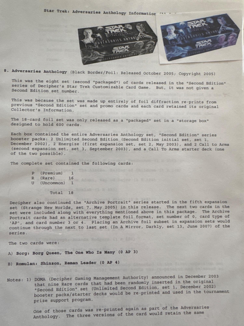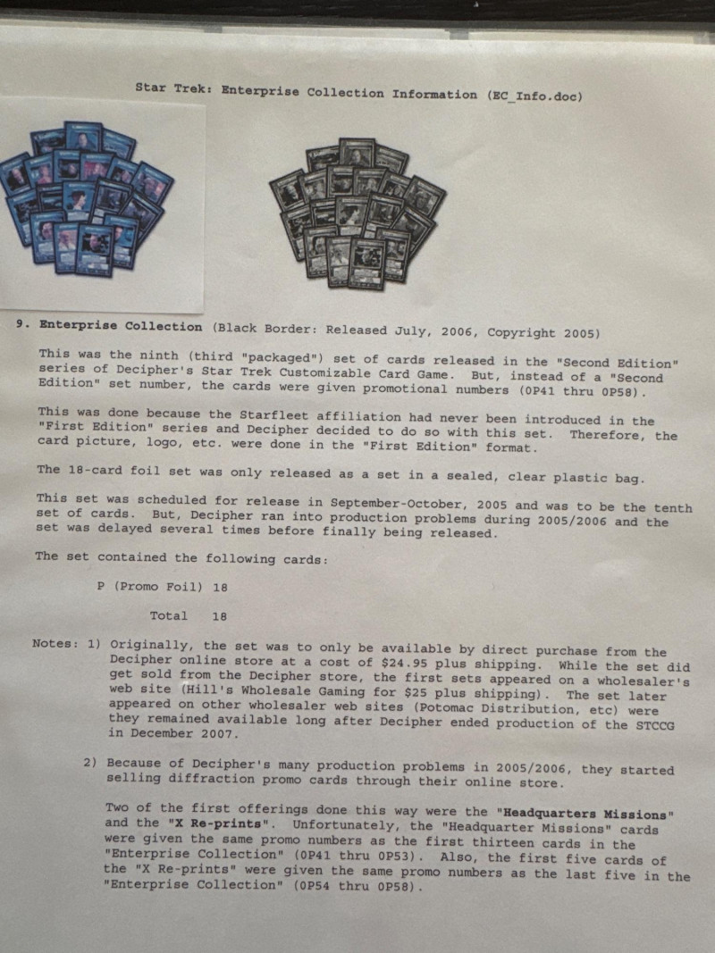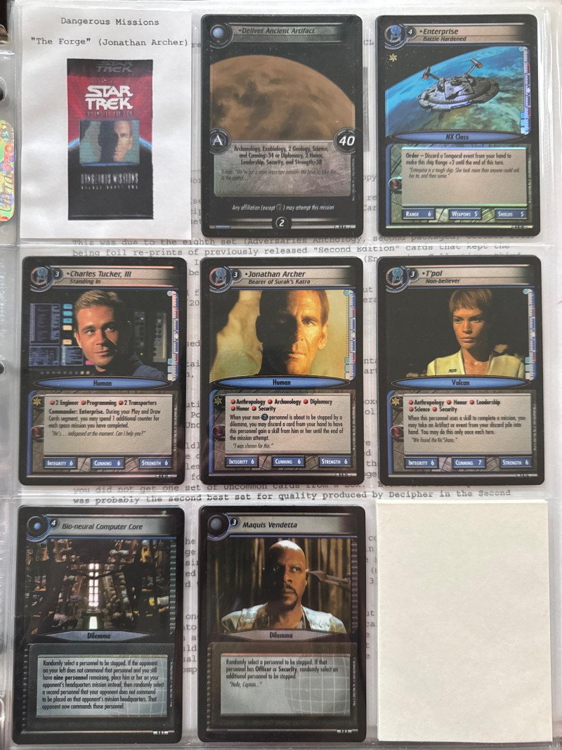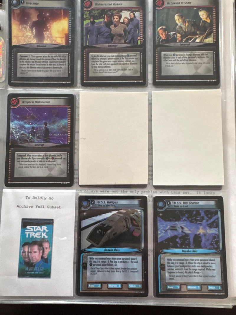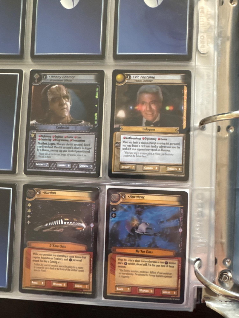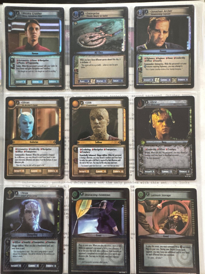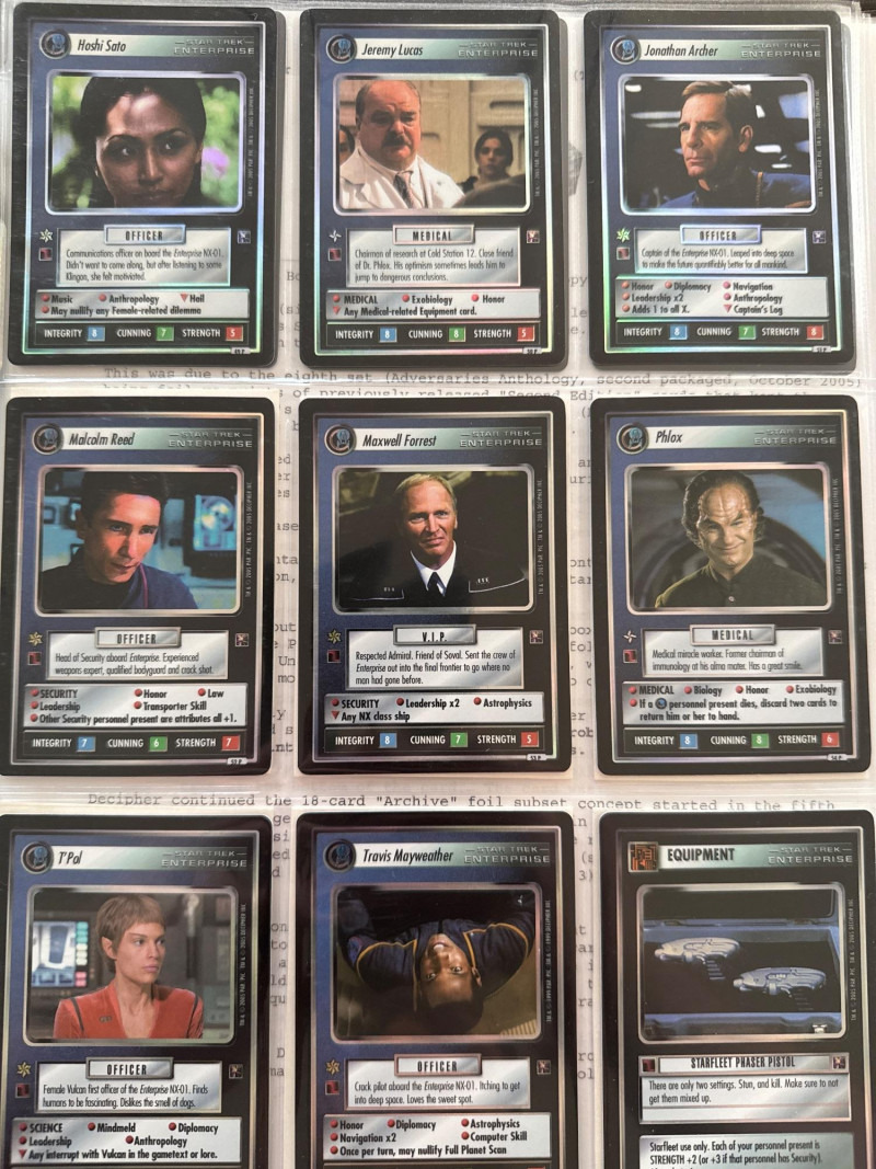 Star Trek customizable card game (CCG) in a collectors album. This album includes the following collections: Strange New Worlds, adversaries’s anthology information (Includes Premium card Queen Borg Cube), Enterprise Collection, To Boldly Go, Dangerous Missions, Captains Log. These collections include many rare cards. The cards are in near Mint condition. It does not look like they were ever used.