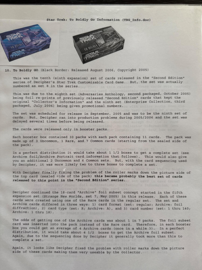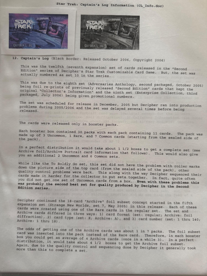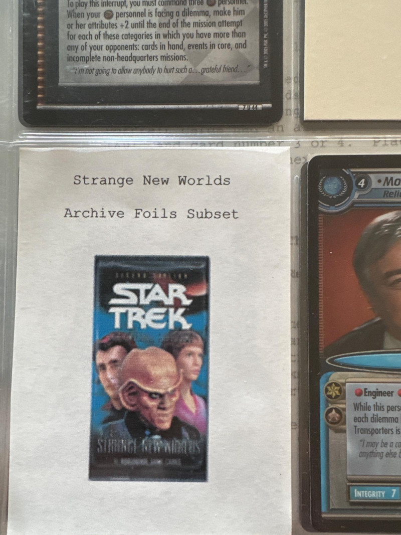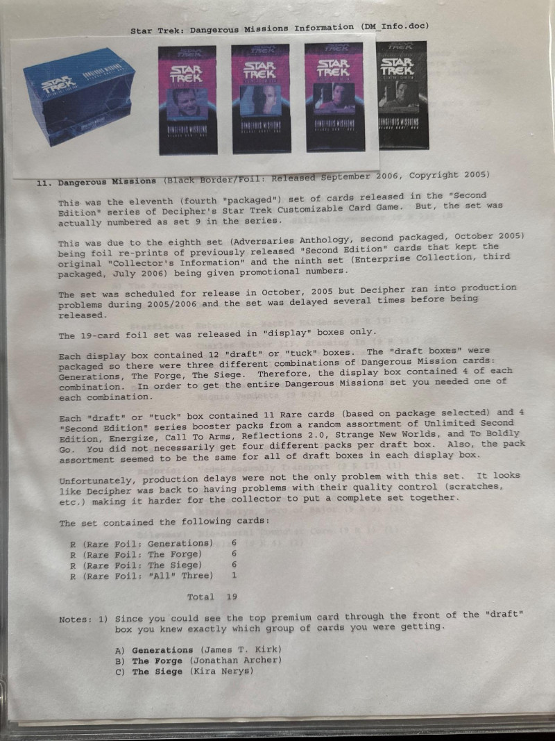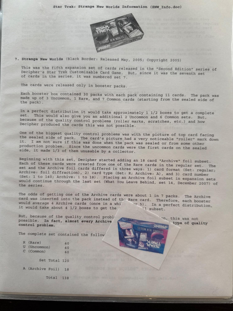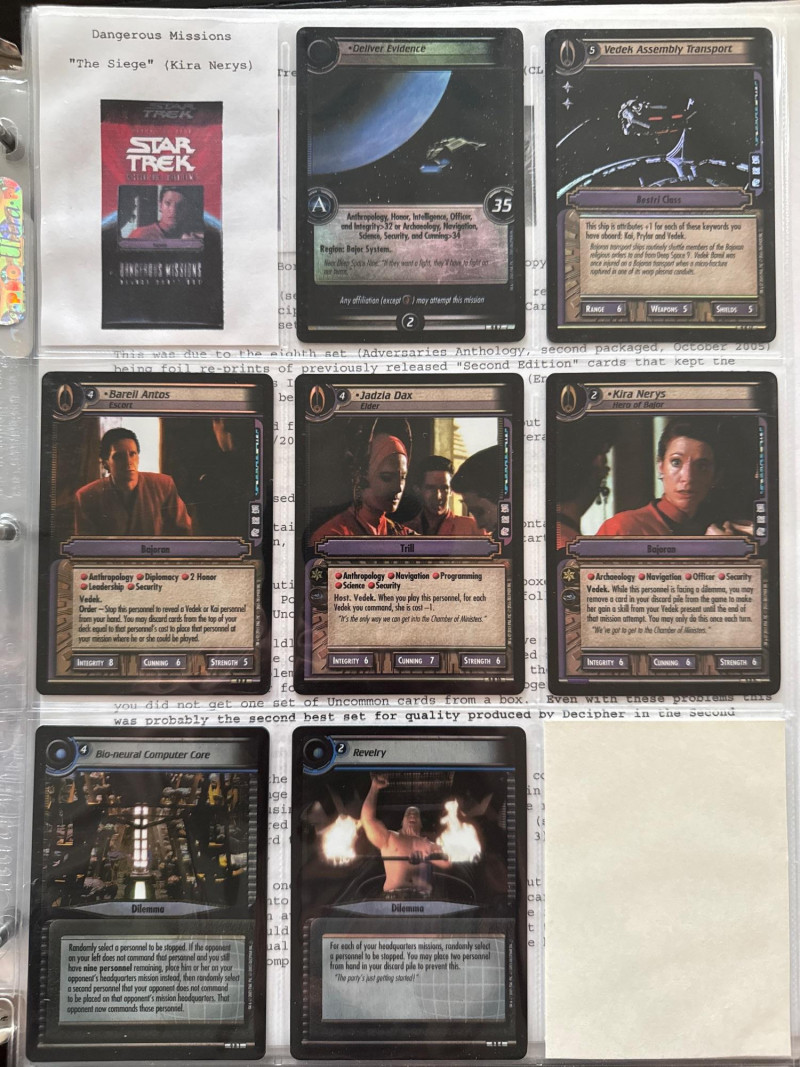 Star Trek customizable card game (CCG) in a collectors album. This album includes the following collections: Strange New Worlds, adversaries’s anthology information (Includes Premium card Queen Borg Cube), Enterprise Collection, To Boldly Go, Dangerous Missions, Captains Log. These collections include many rare cards. The cards are in near Mint condition. It does not look like they were ever used.