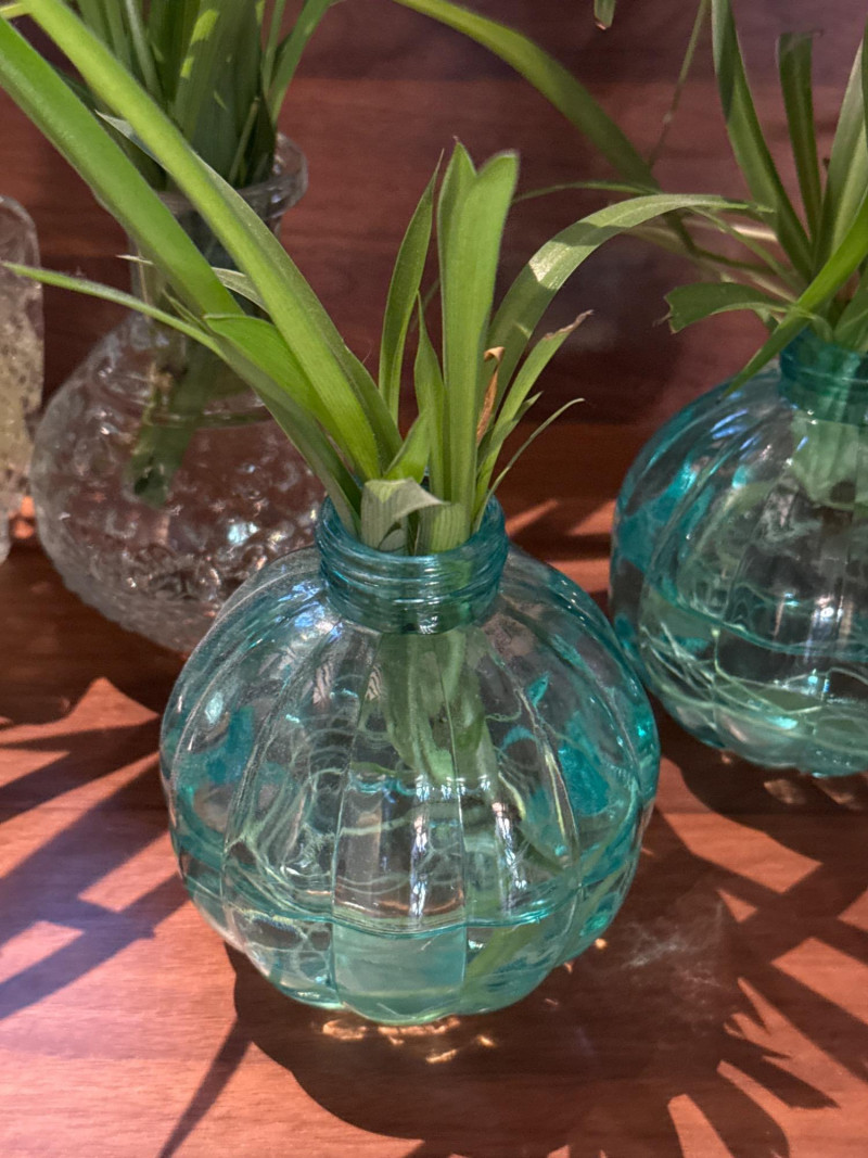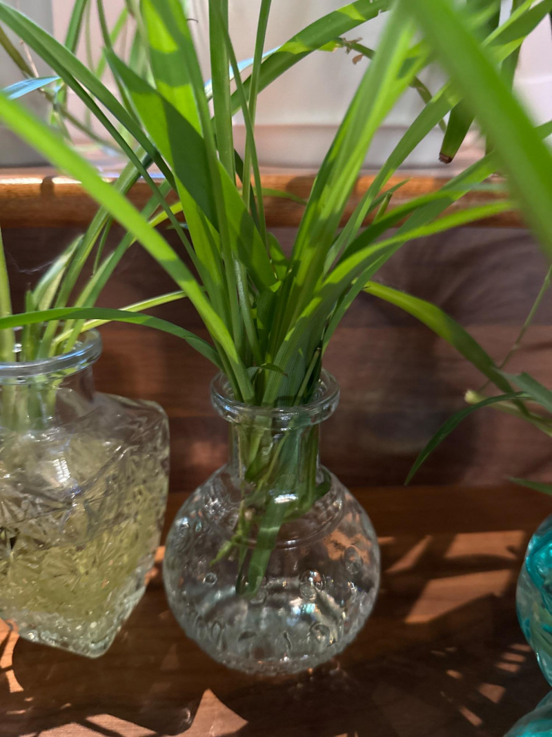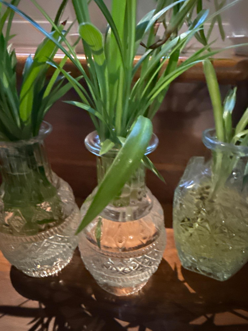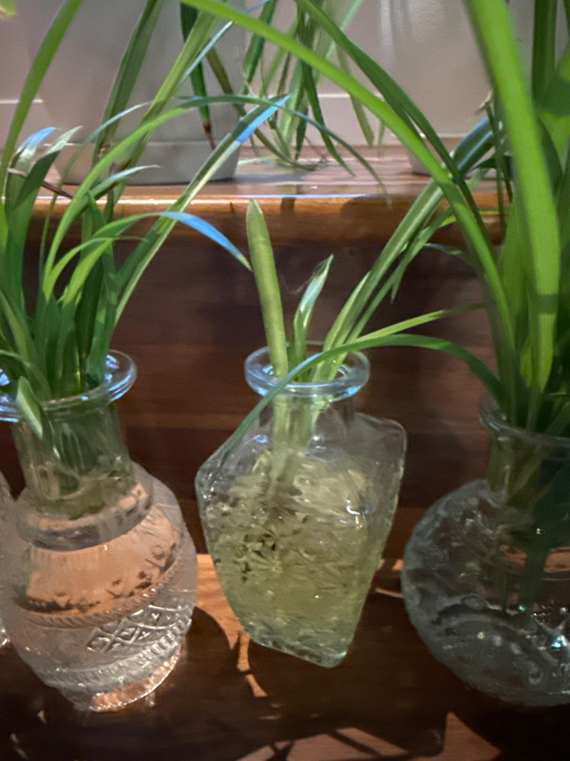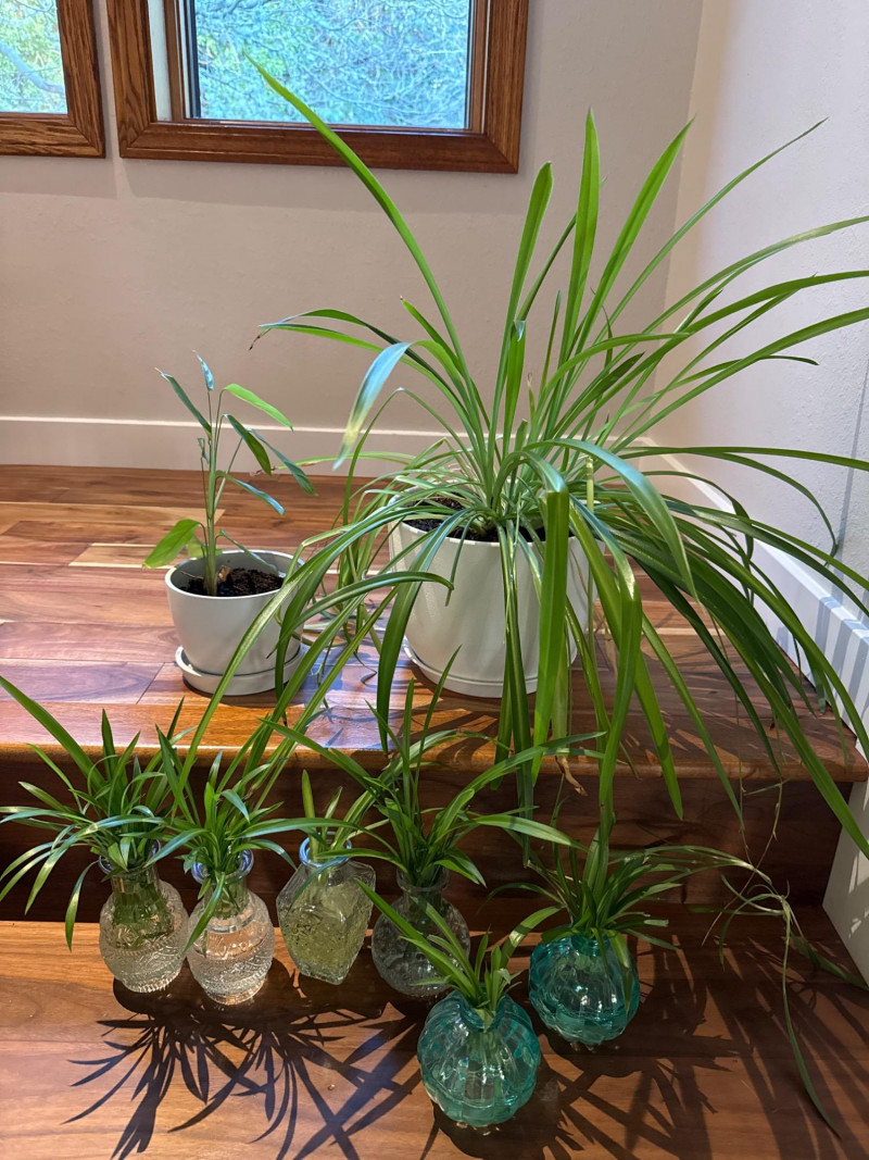 Multiple spider plants and one never never plant in assorted containers.