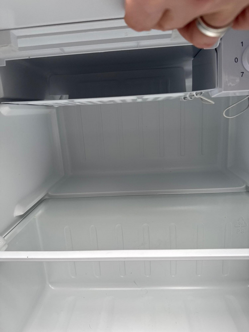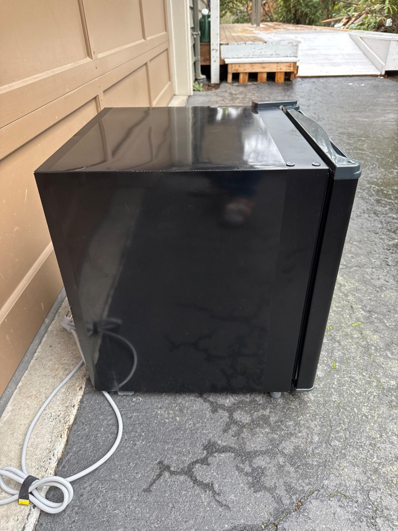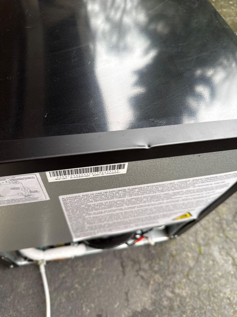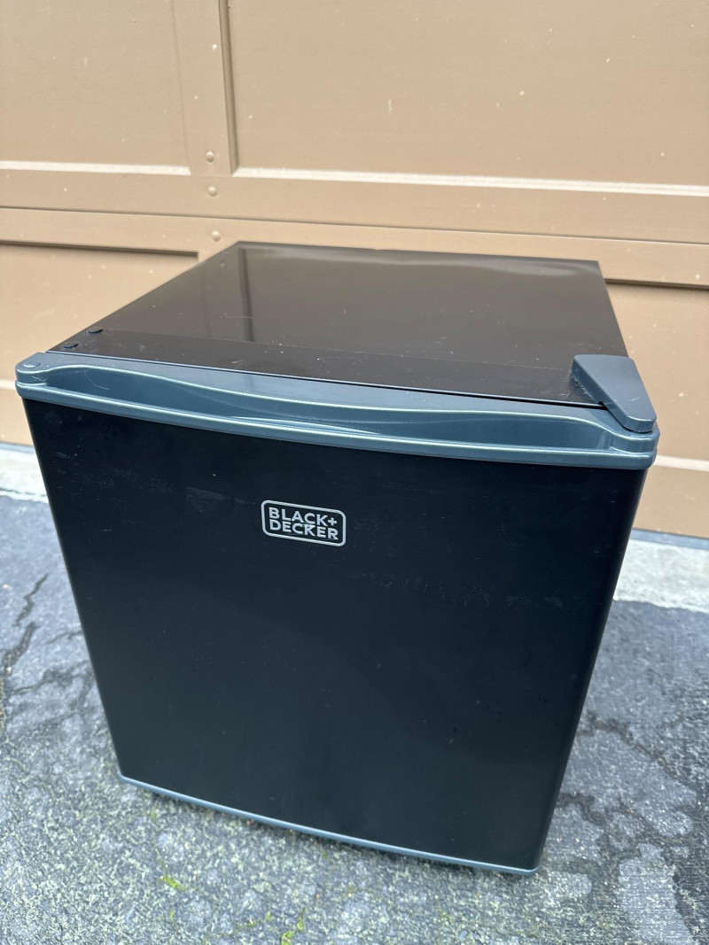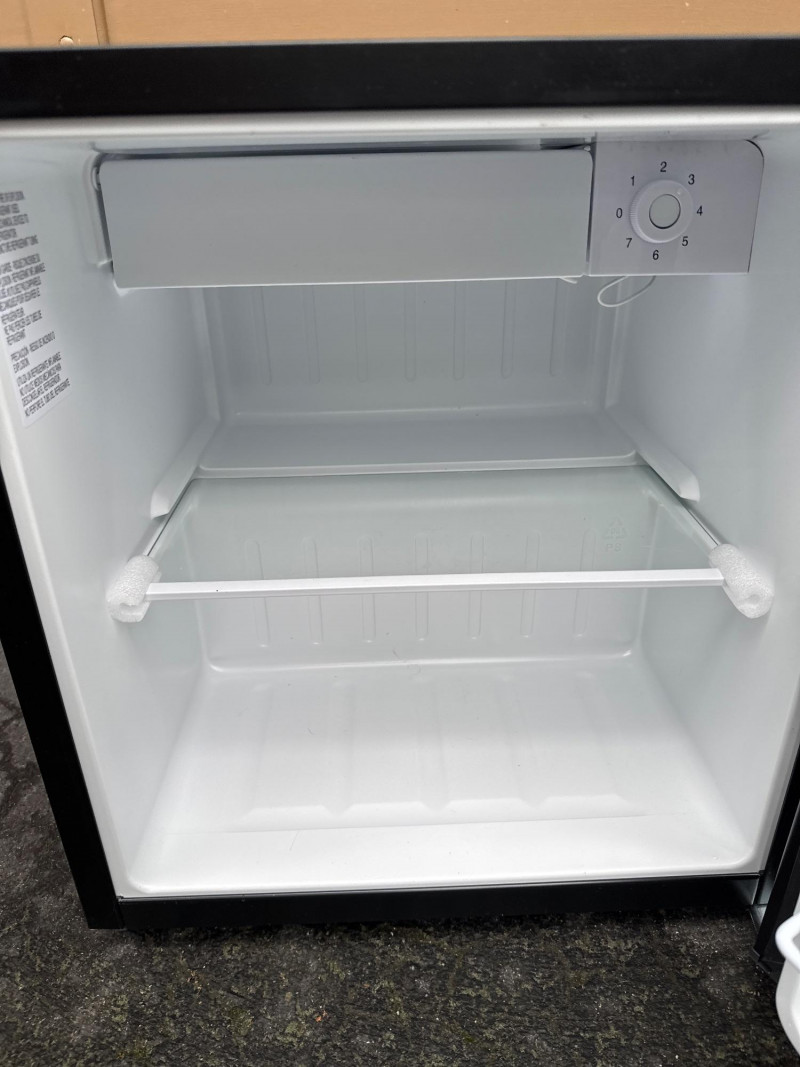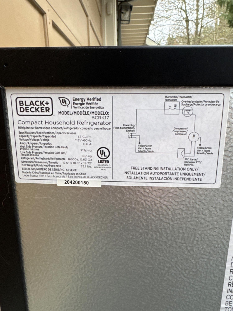 Model BCRK17 is 1.7 cubic feet by Black and Decker. There are a couple of light dents in the back that happened during shipping but did not cause any problems with operation. It also has a small freezer to keep some ice cubes. Works perfect perfectly great little fridge for an office, dorm room or garage.