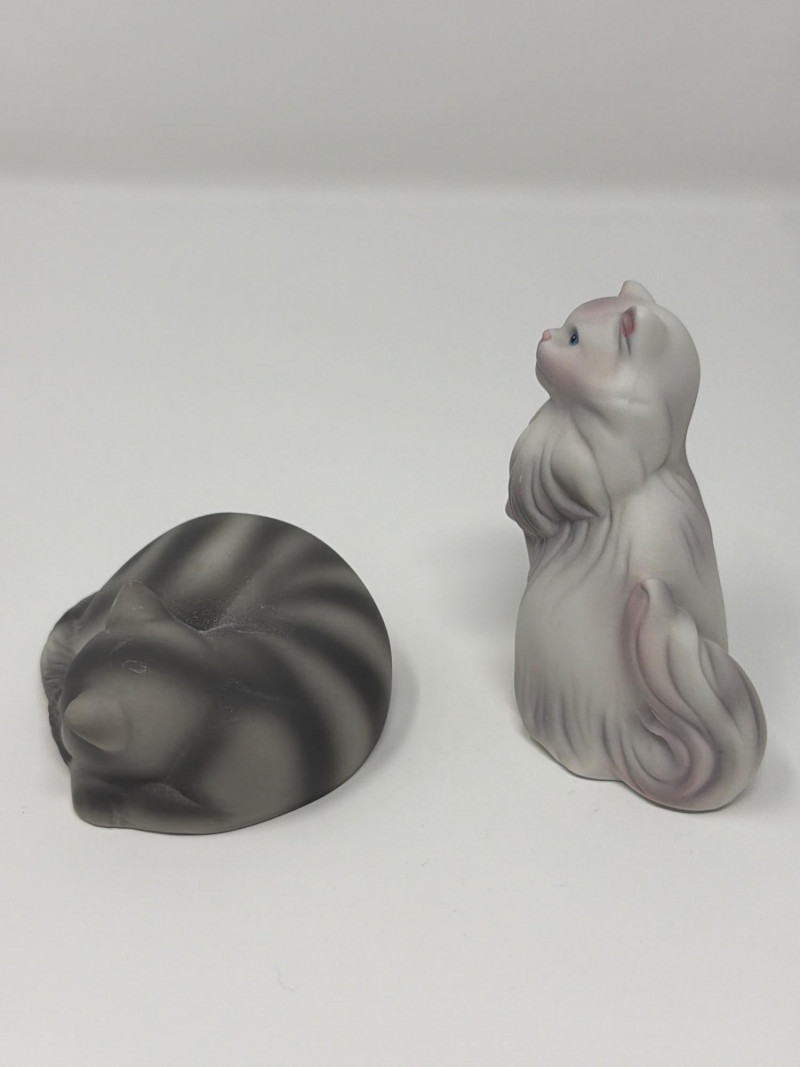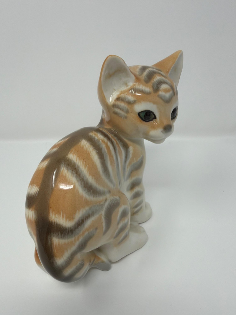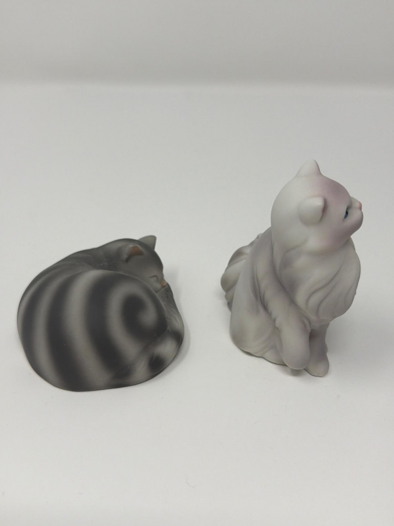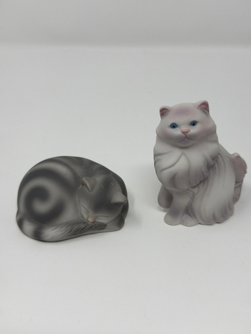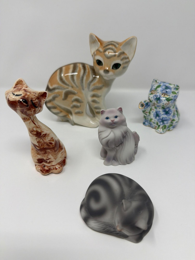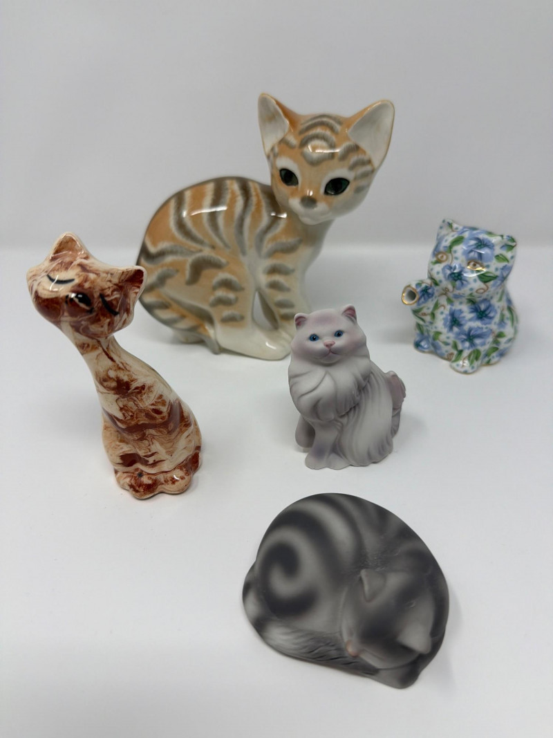 Assorted vintage and collectible cat figurines in ceramic and porcelain.