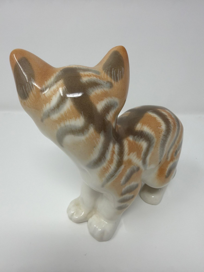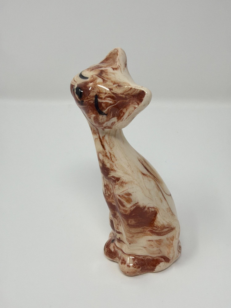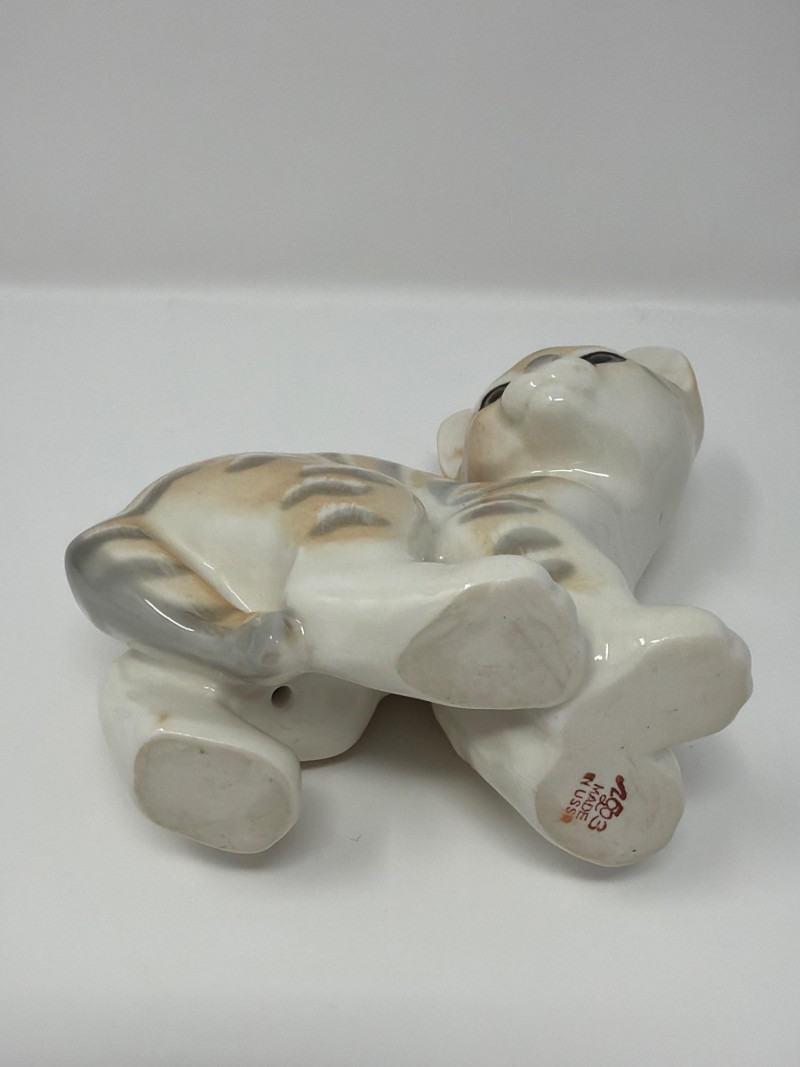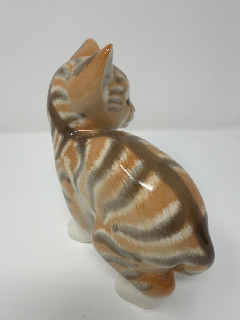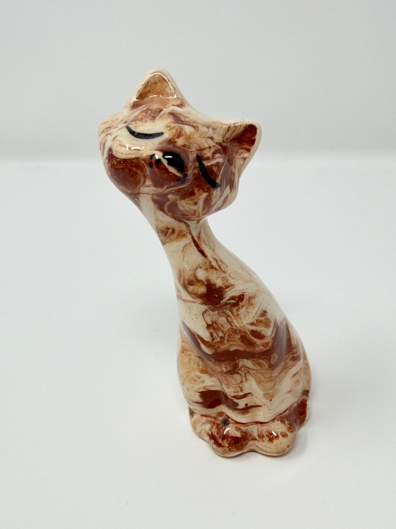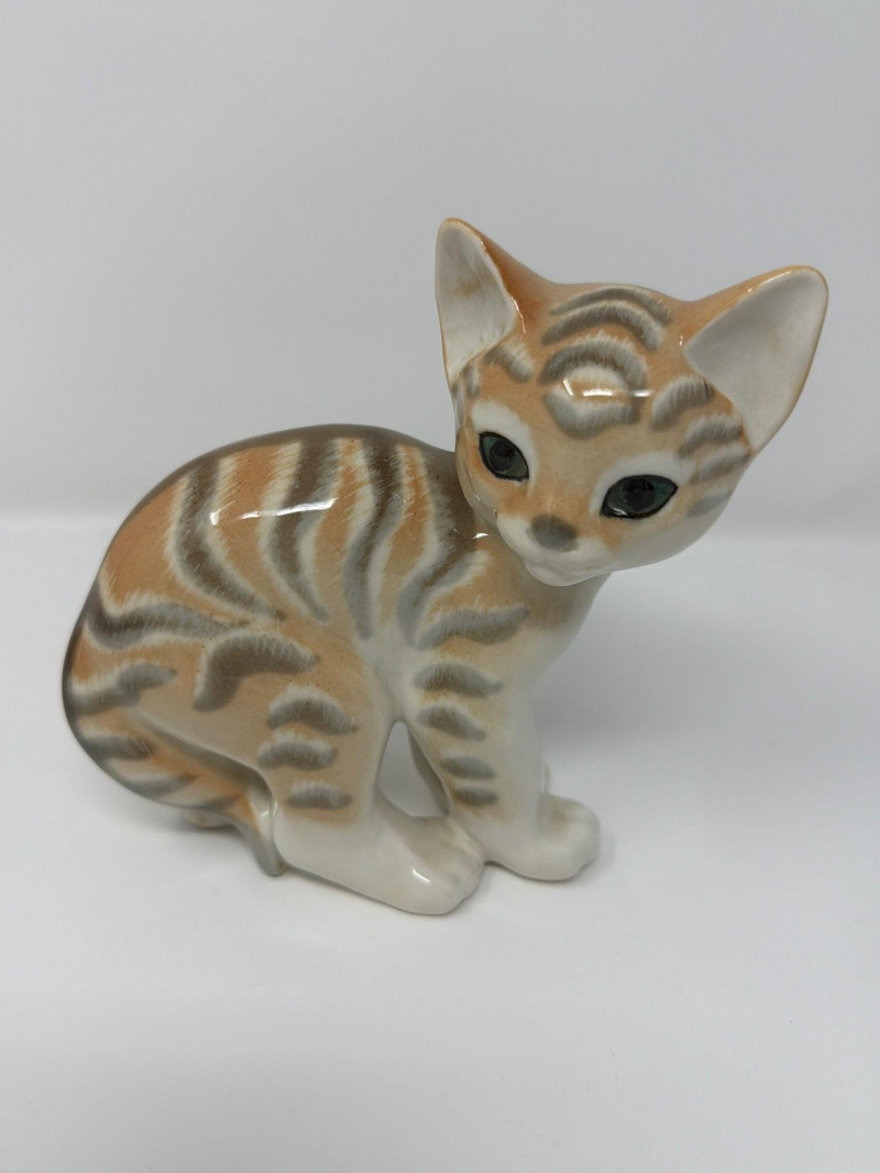 Assorted vintage and collectible cat figurines in ceramic and porcelain.
