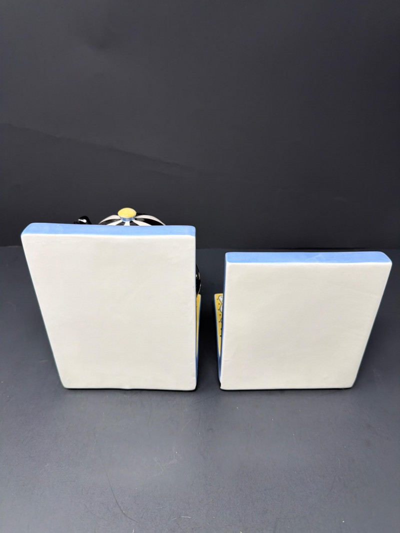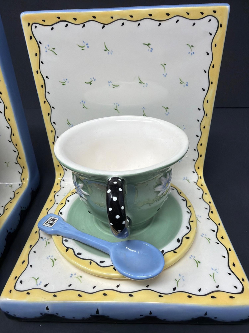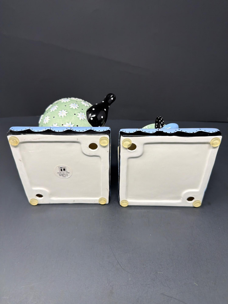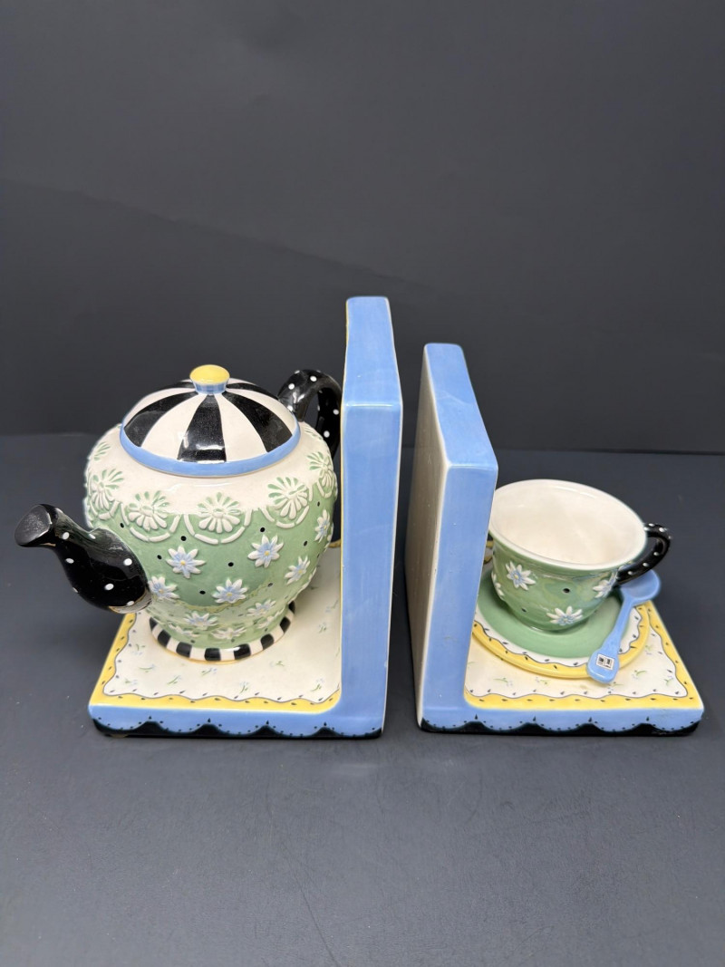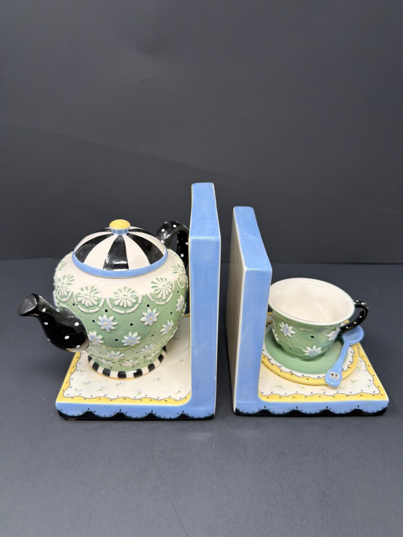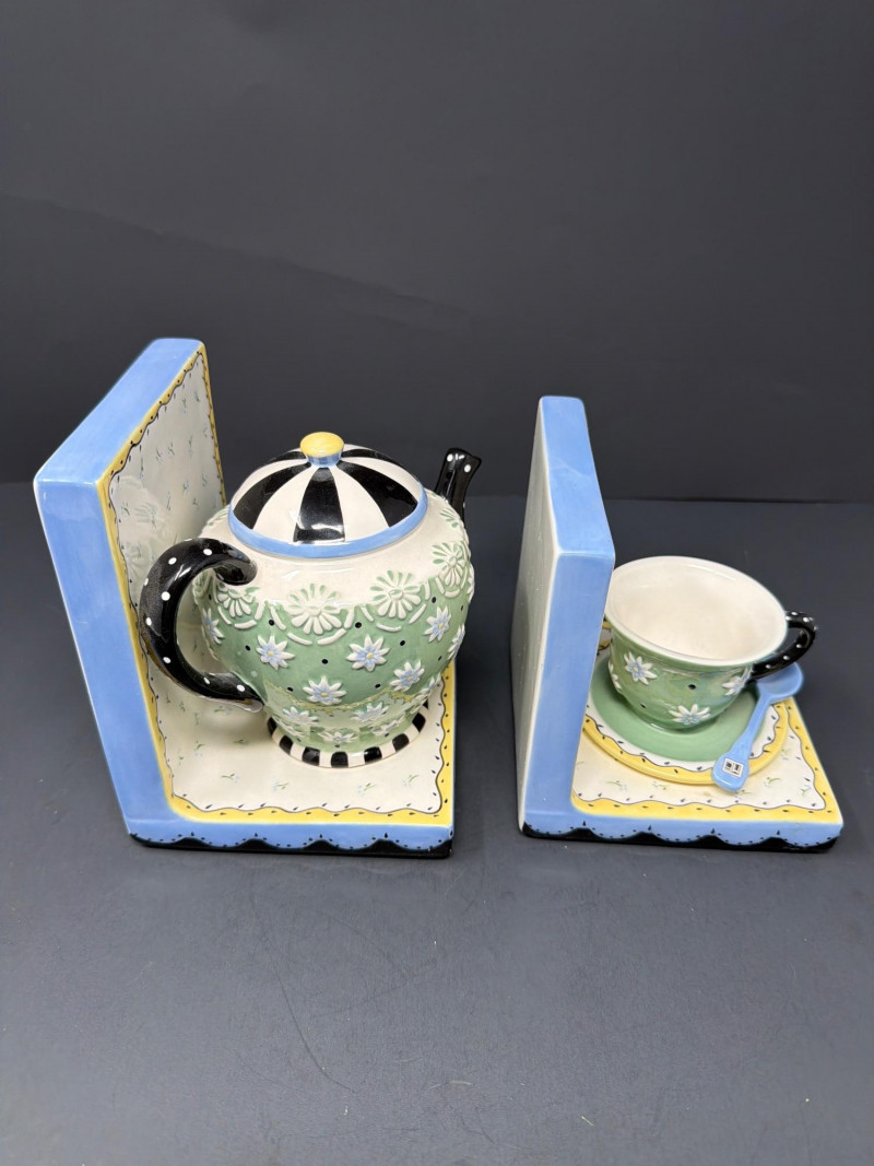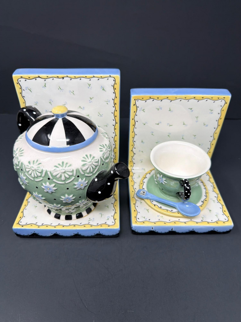 Porcelain bookends from the Time for Tea collection by Mary Engelbreit, dated 1998.