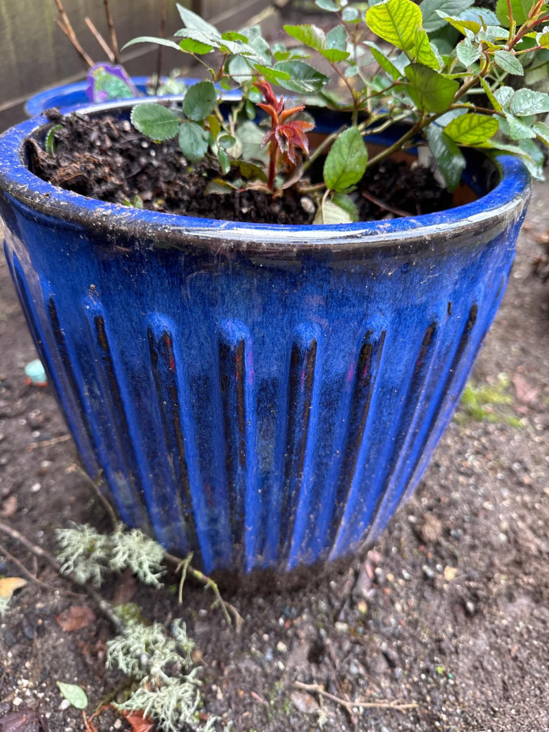 Five Beautiful blue ceramic planters with live plants small to medium size. Largest is 11 inches tall by 12 inches wide. The smallest is 7 inches tall by 9.5 inches wide.