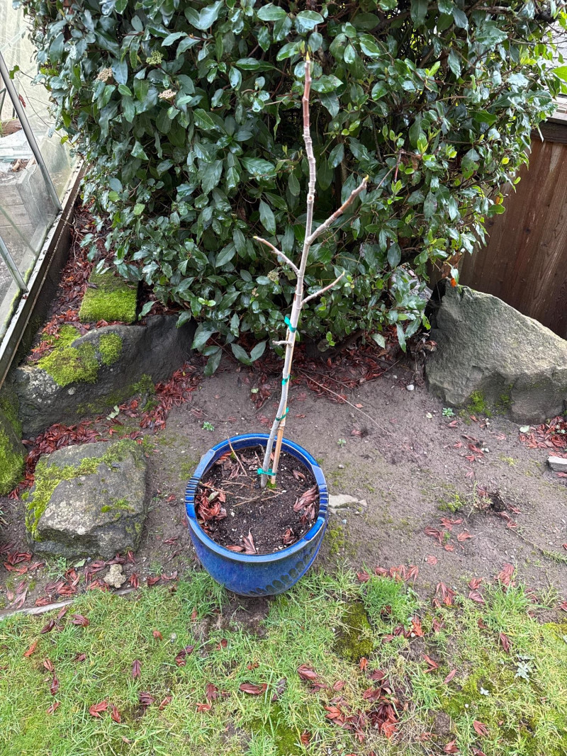 The rim is thick and uneven in a deliberate, sculpted way, giving it a handcrafted look. The glaze is shiny and reflective, with subtle variations in tone. includes a fig tree plant.