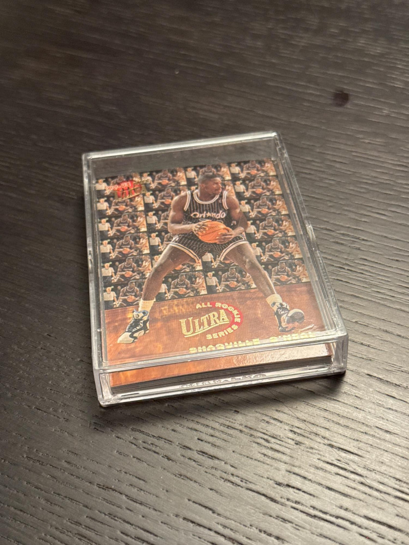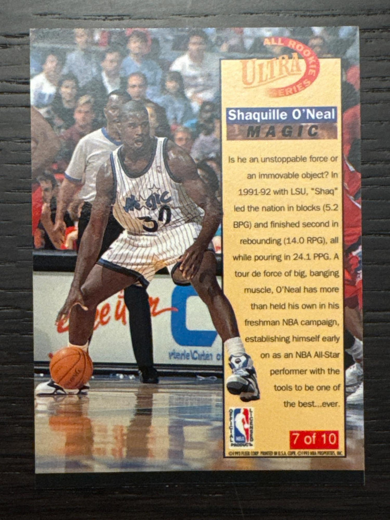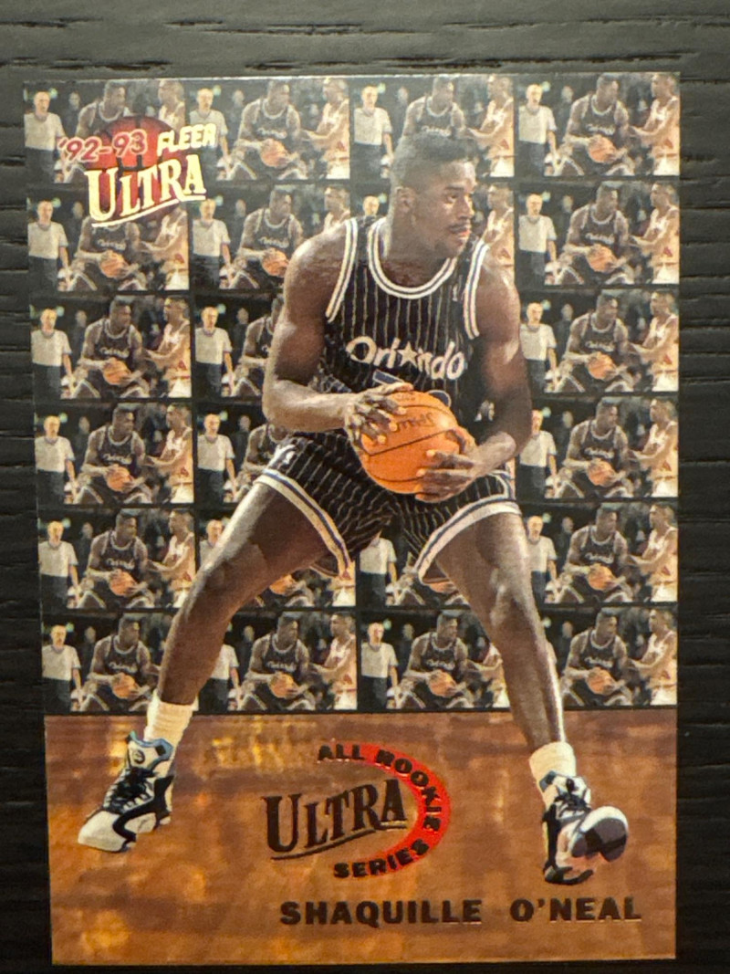 Several 1992-93 Fleer Ultra basketball trading card featuring Shaquille O'Neal during his rookie season with the Orlando Magic in the NBA. This card is part of the All Rookie Series insert set, known for its collectible value among basketball card enthusiasts. It is a base variety card manufactured by Fleer, making it a sought-after item for fans and collectors of sports memorabilia. In mint condition, stored in a plastic box since opened.